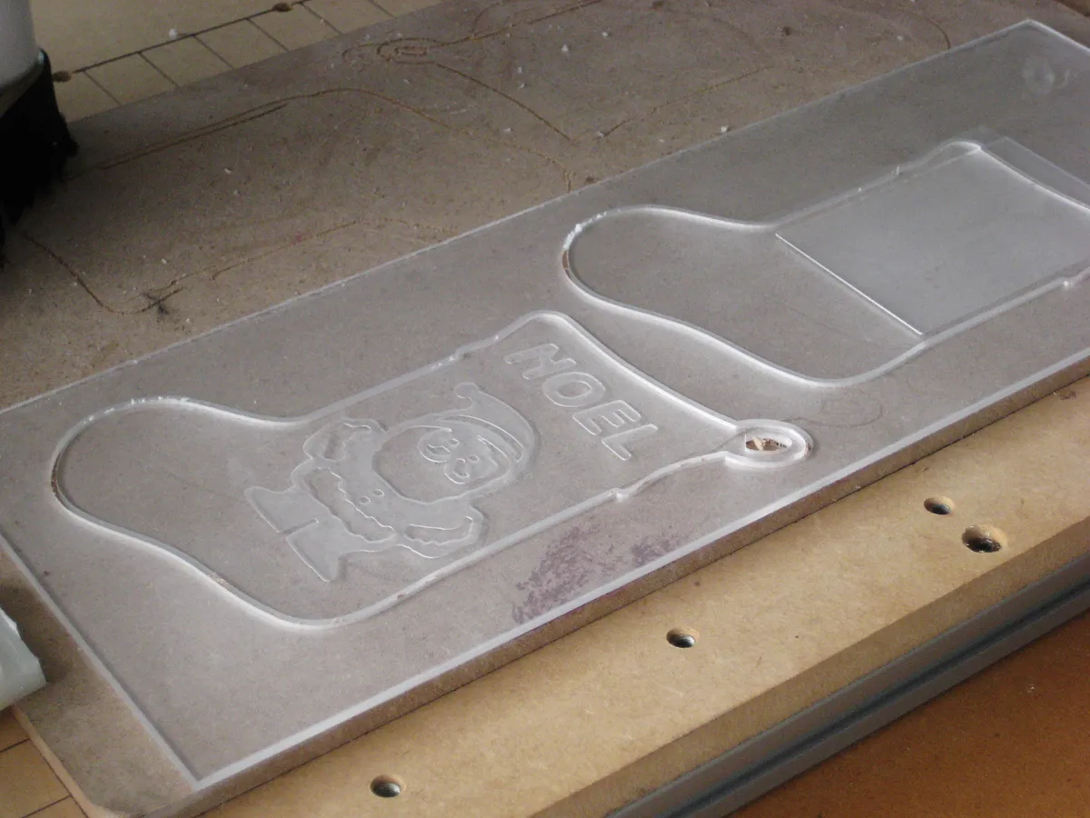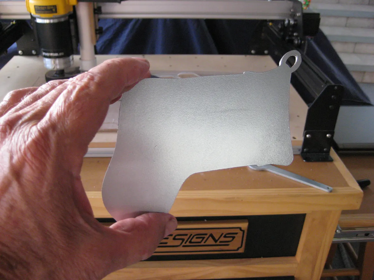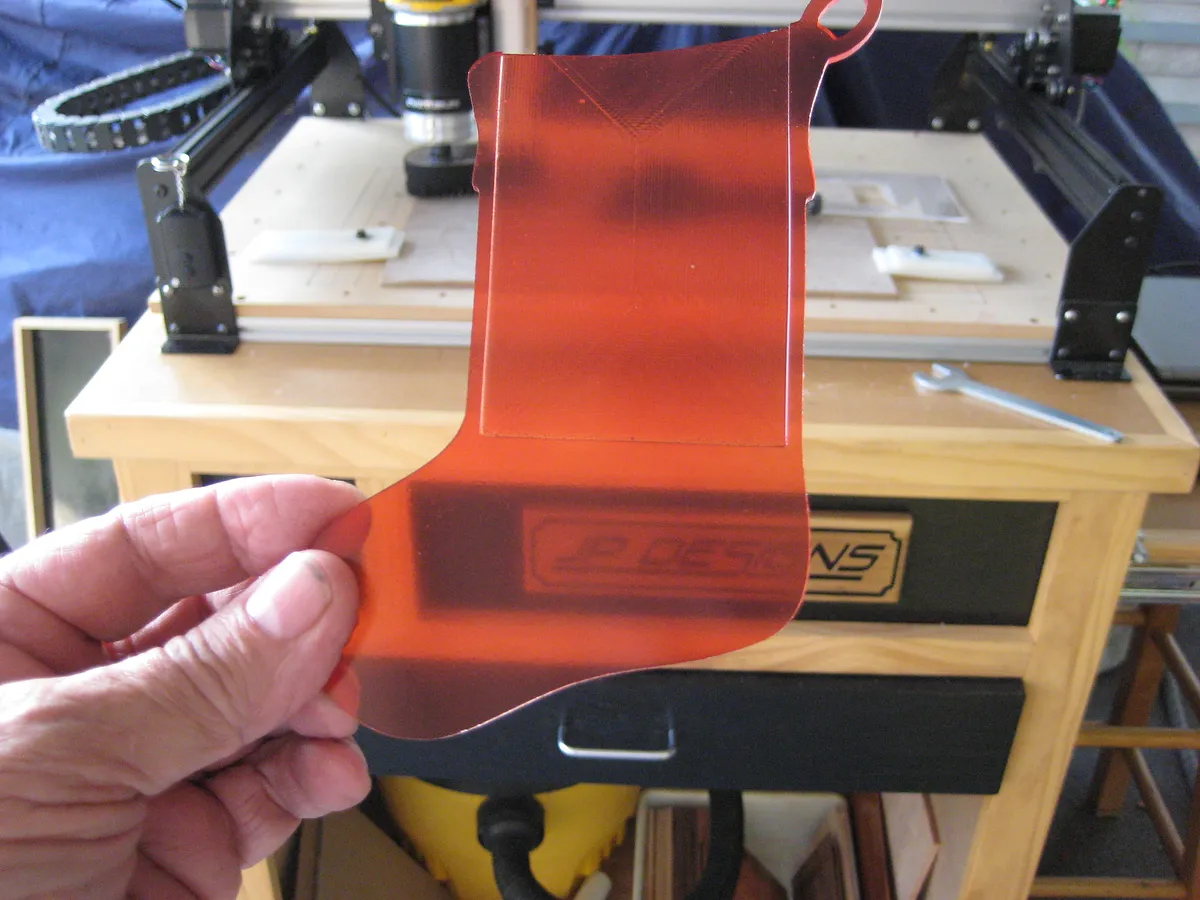I was short on cast acrylic material, so I just picked up a cheap sheet of .100 extruded plastic at our local Ace Hardware. Since I would be cutting completely through the material, I used 3M 77 spray adhesive to mount the plastic panel, (leaving the protective covering on the glue side) to my sacrificial board . I removed the clear top protective cover, as it sometimes gets wound around the bit and makes a mess. I used a .0625 2 flute up cut bit running at 100 imp & doc at .03 with my Dewalt 611 set on the slowest setting.