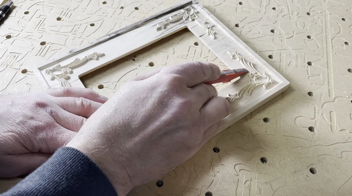 Now that all of the carving is completed you can cut the tabs on your frame and sand all of the surfaces. I used a small detail sander to get around the decorative carvings in the corners of the frame. Using your patience here will make a better looking final product.