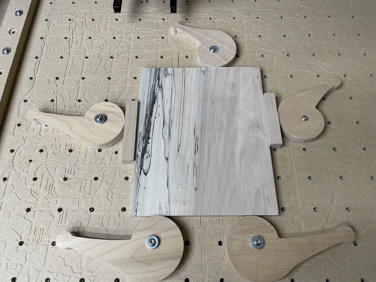 Once you have your piece of wood cut to the 9" x 11" x 1/2" thick size you need to clamp it securely in your X-Carve. I use cam clamps, but you can use an alternate method.