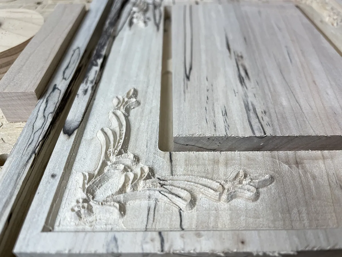 This part of the carve will be the longest. The roughing pass will take approximately 54 minutes with a 1/4" downcutting bit. The detail pass will take approximately 56 minutes with a 60 degree V bit.