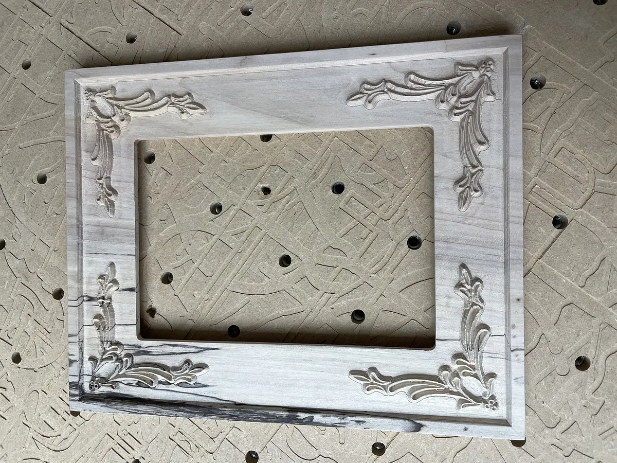 Next we change back to the 1/4" downcutting bit to cut the outline of the frame and the picture opening. This took about 45 minutes. The file is set up with tabs to the frame doesn't move while carving.