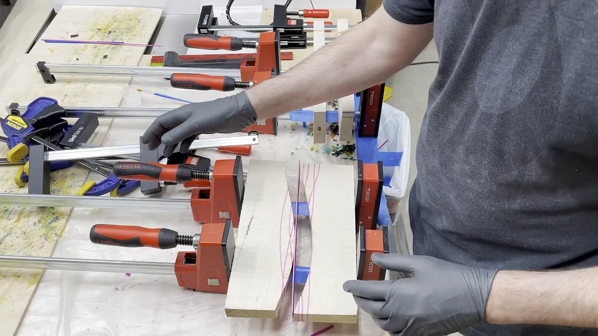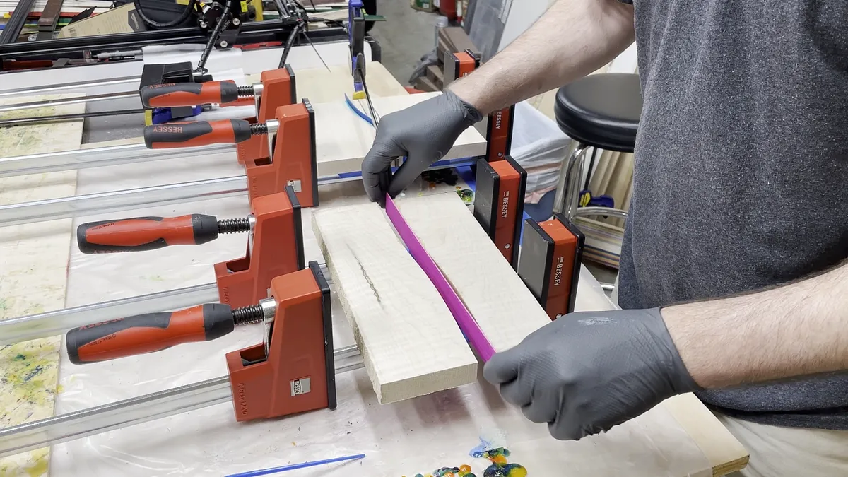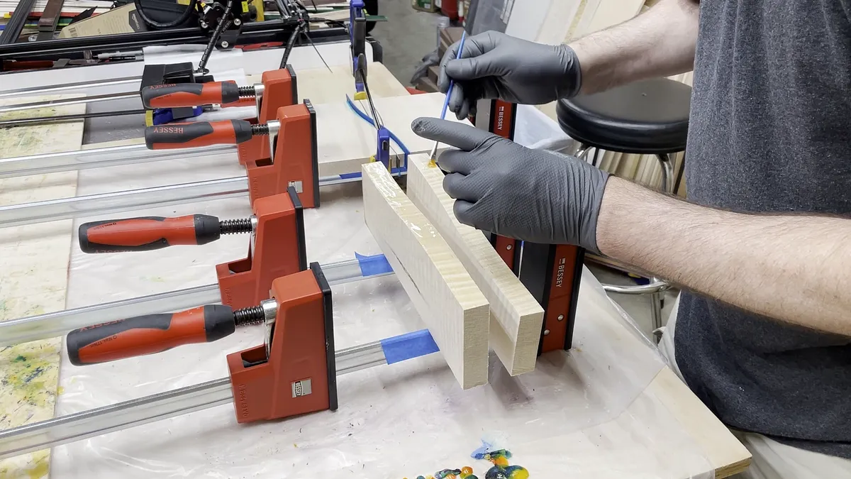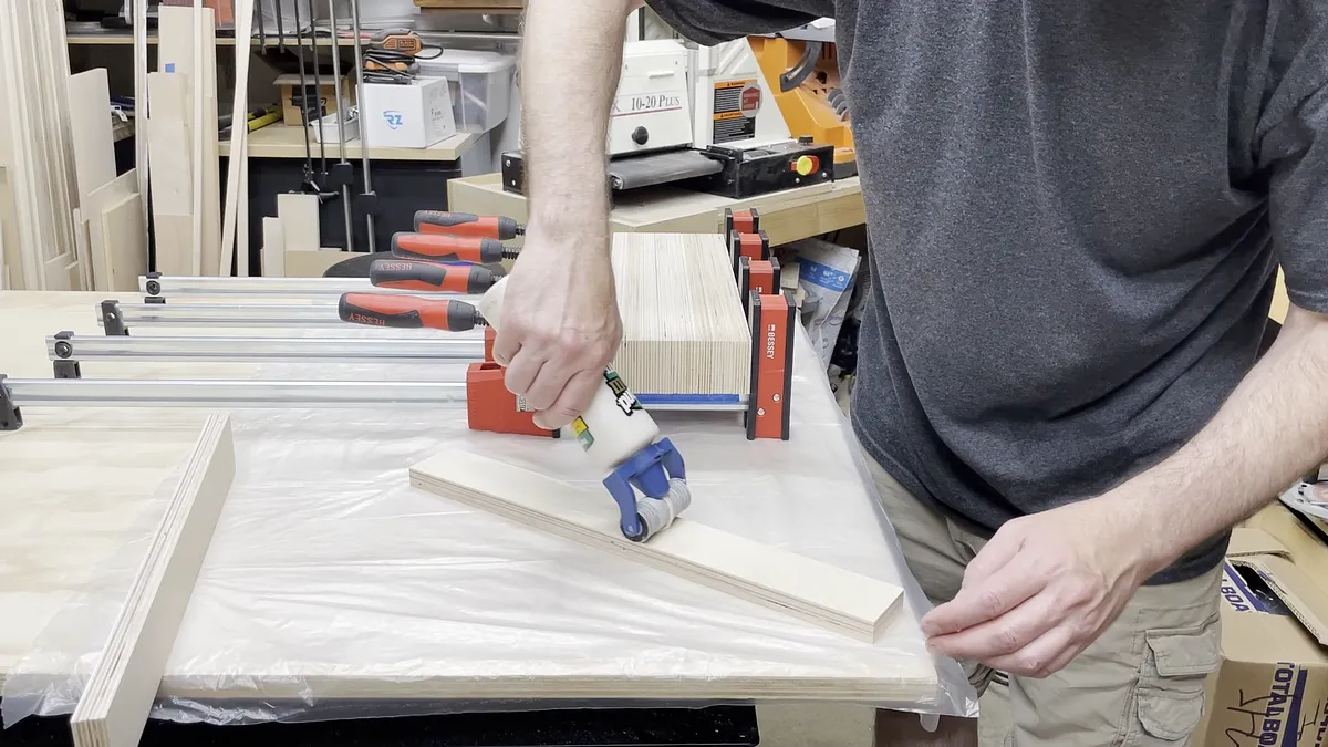 Gluing up the veneer pieces is fairly easy. You just want to take your time and have all of your materials ready. This process does use a lot of wood glue so you should have a little more than you anticipate ready to use. One thing I found that makes this process faster and more enjoyable is using a glue roller like the one you will see in the video. This one is manufactured by Rockler. As you squeeze the glue from the bottle the glue gets spread out over the strips of veneer.