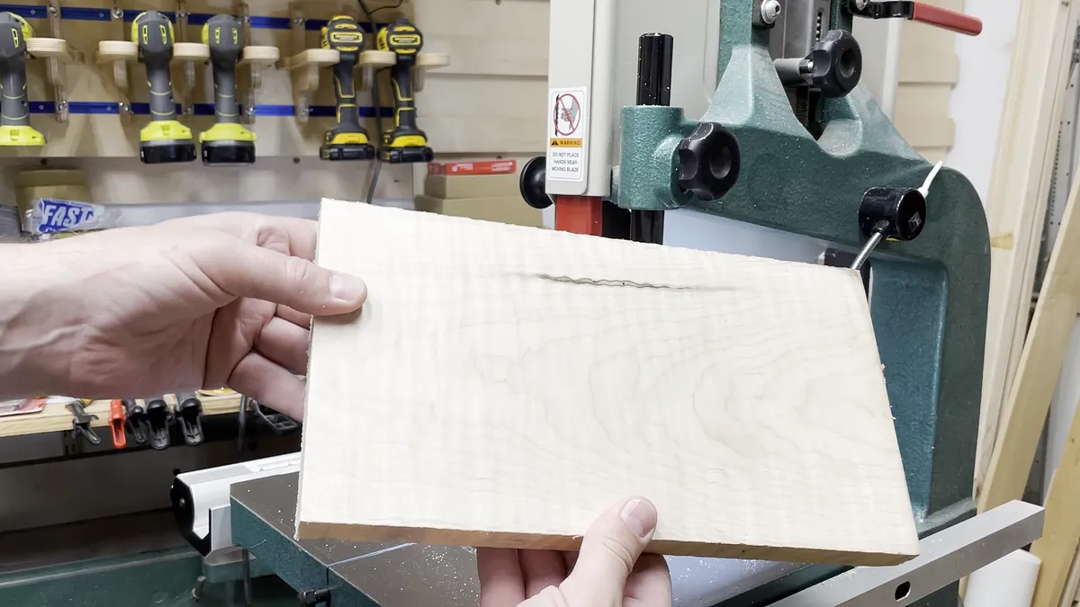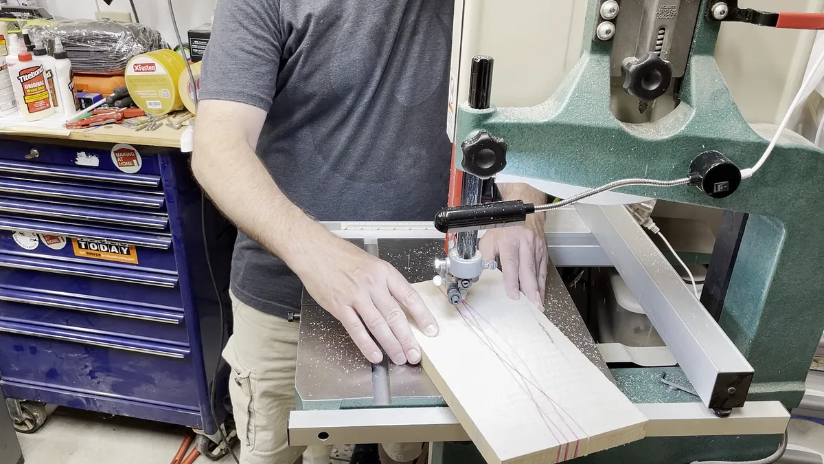 The veneer I used for this project came from Cousineau Wood Products and is made for making skateboards. It comes in 10” wide strips that are 41” long and 1/16” thick. To cut it into strips to be glued together I first cut off a piece of veneer that was a little longer than the wood blank I wanted to make.