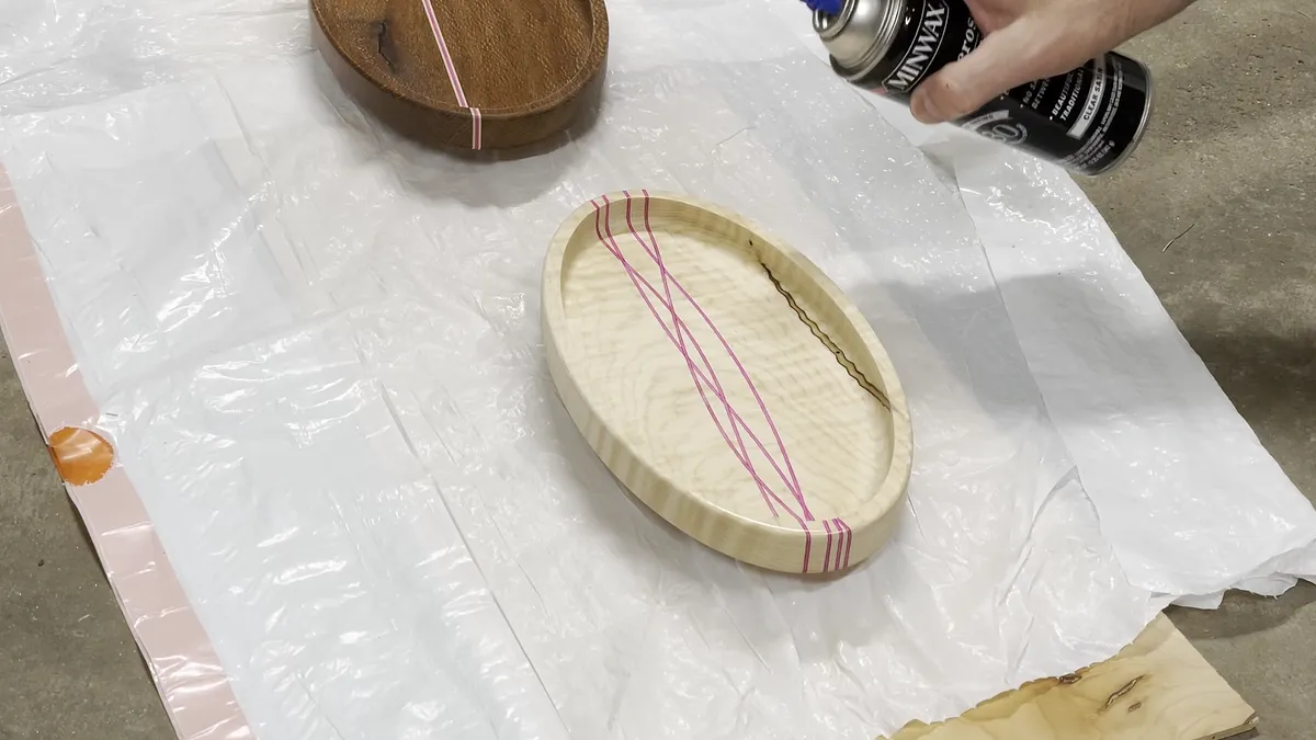 For the finish on these trays I decided to use a spray on lacquer. It goes on easy and in about 30 minutes, depending on temperature and humidity, you can add another coat. In my case I could flip the piece over and add the spray lacquer to the other side fairly fast.