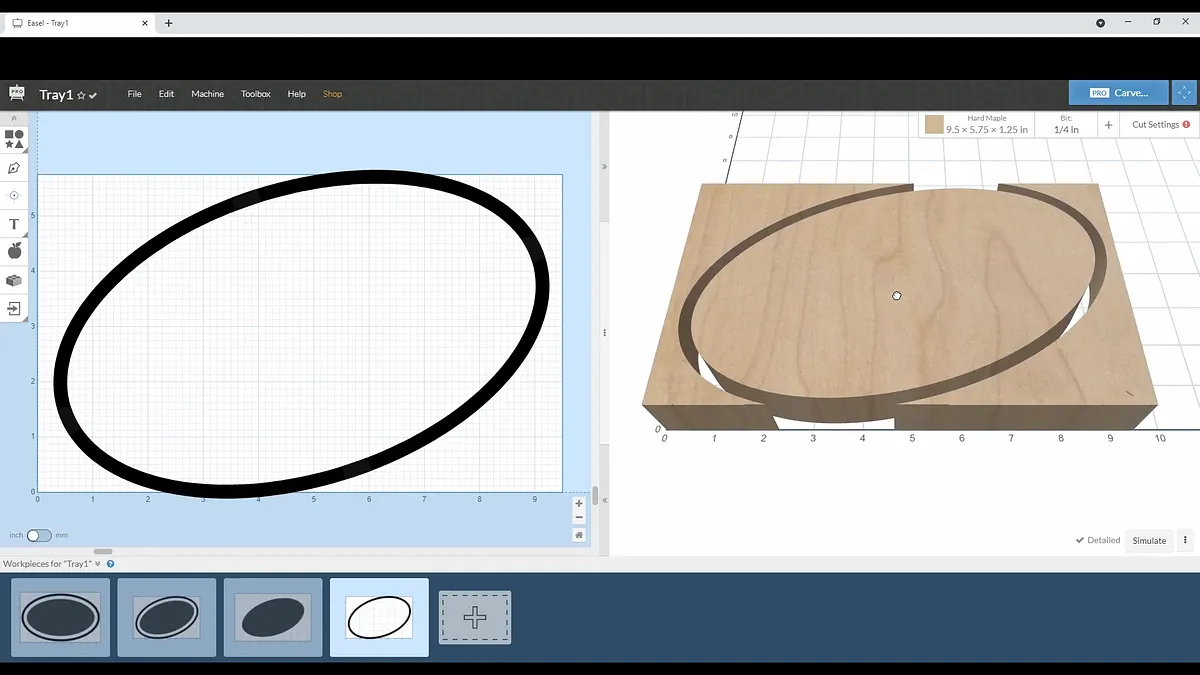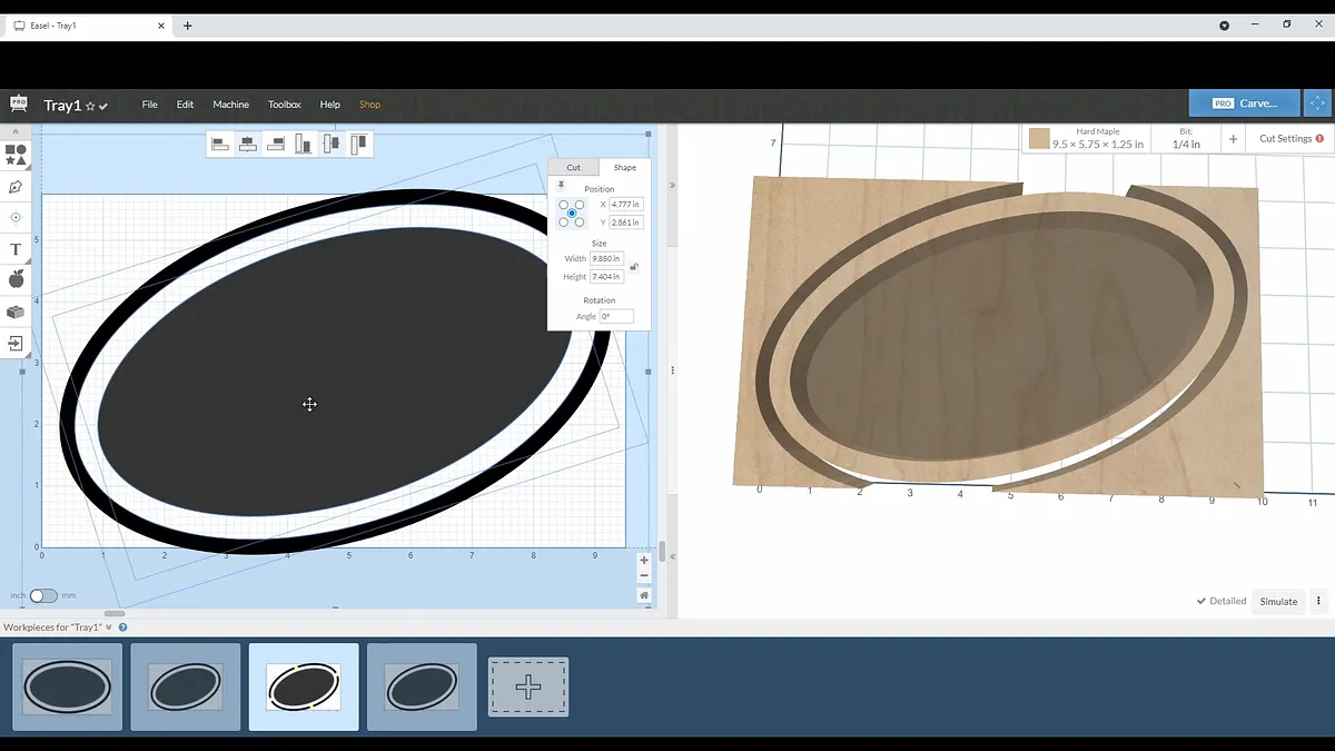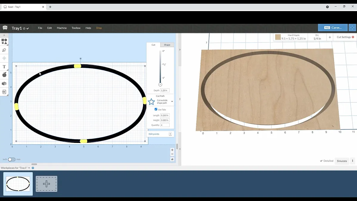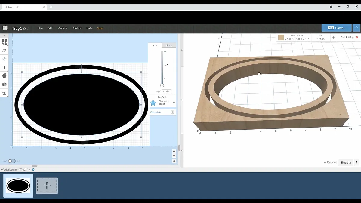Once you select OK, you will see a new oval has been added to your work area. Select the inside work piece and set the cut setting to carve out a pocket. Set the outside piece to carve to the outside.