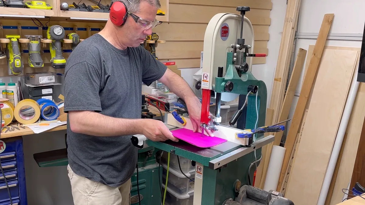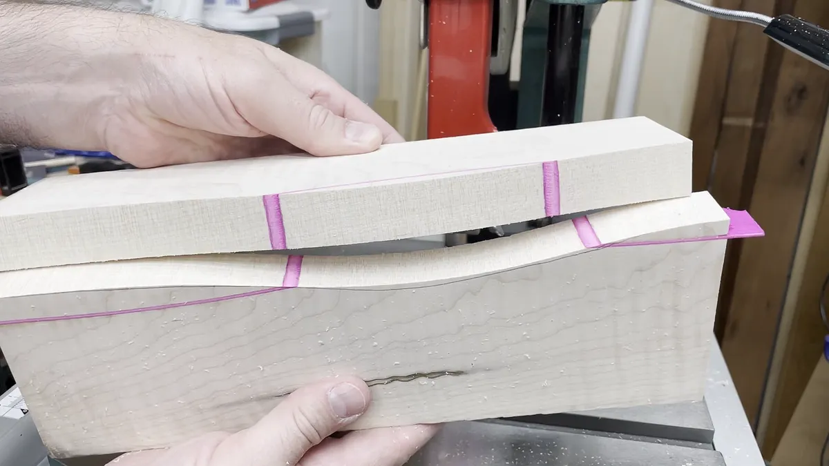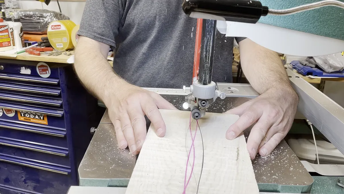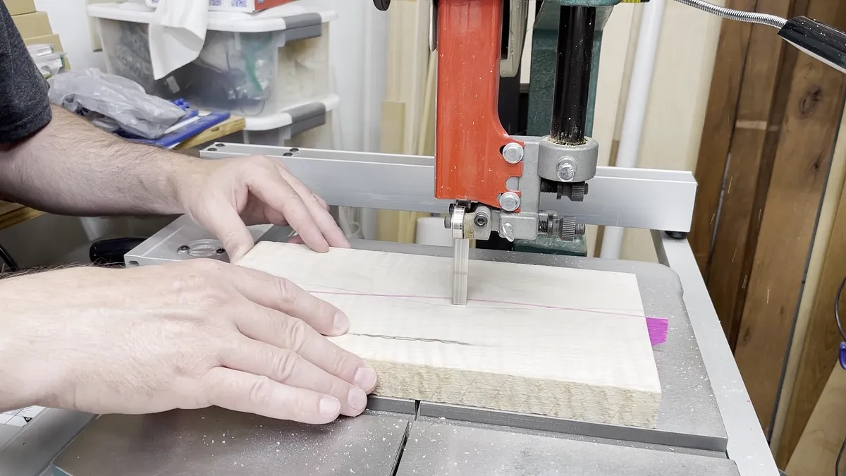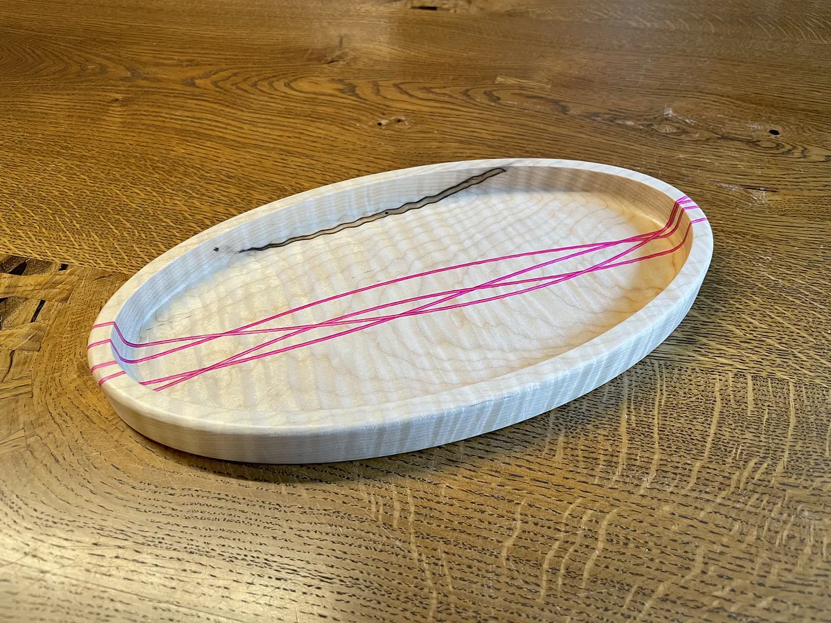 The wavey veneer tray is created by cutting wavey lines through a wood blank with a band saw. The strip of veneer is glued in place using epoxy. After this sets up you can repeat the process and cut another wavey line into the blank. For this example, I used 1/16” thick pink veneer strips in a curly maple wood blank. The pink lines really give a contrast to the maple and are an eye catcher.