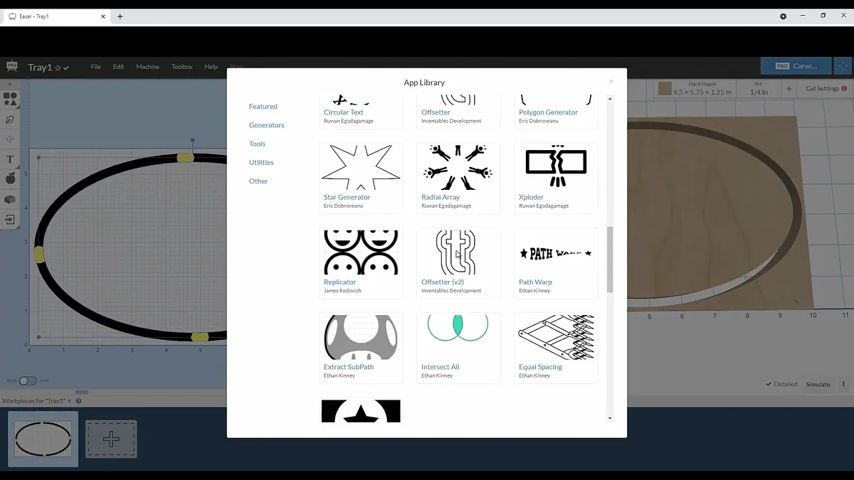 To create the offset, make sure you have the oval shape selected and then go into the apps menu in the Easel software. I always use the version 2 of the offsetter app. Select the options for offsetting to the inside, just make on instance, and set the distance to offset at 3/8”.