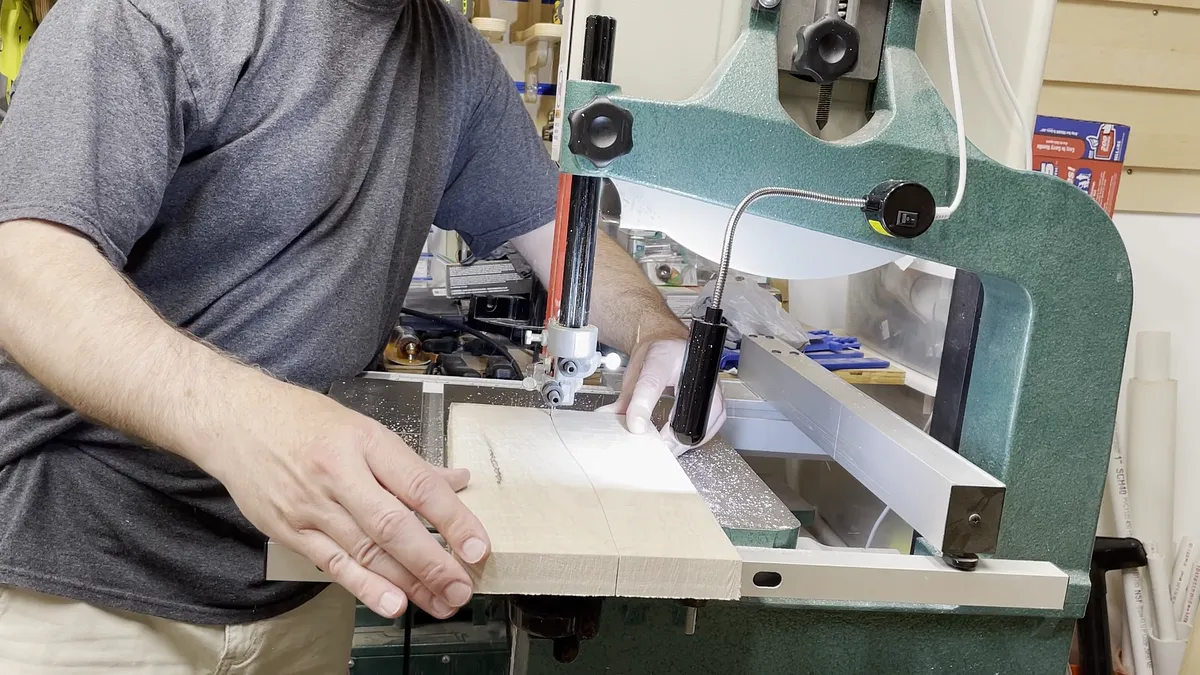 The kerf on my bandsaw blade makes a cut that is slightly narrower than the 1/16” veneer that I used. To help account for that difference in width, I passed each side of the cut across my spindle sander to smooth out the bandsaw marks. Since it would be hard to get this to a perfect fit, I glued the pieces together with epoxy. This helps with any unevenness of the cuts and fills the gaps.