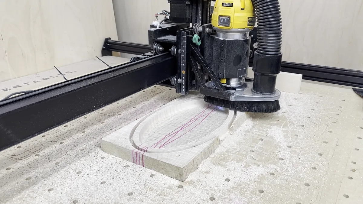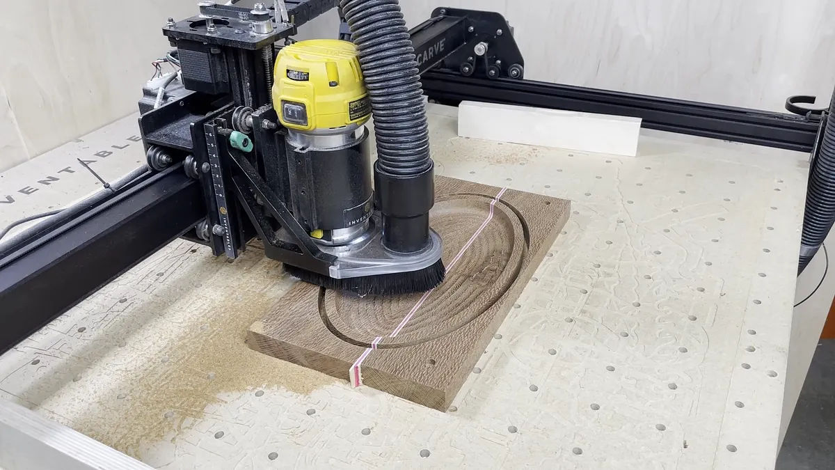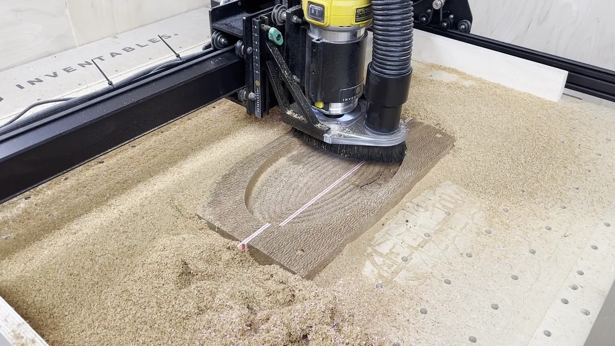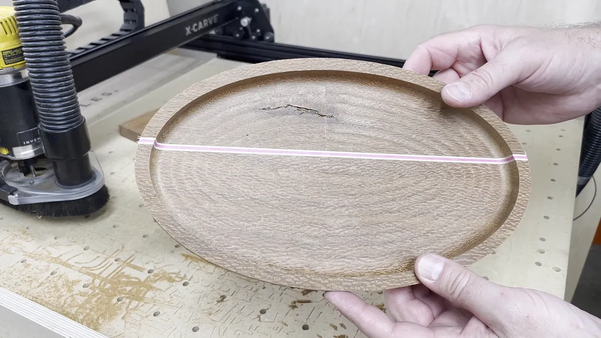 The tools I used on the project were as follows: X-Carve 1000mm CNC Machine by Inventables - "Link":https://www.inventables.com/technologies/x-carve?ref=MakingAtHome 1/4" diameter downcutting bit - "Link":https://amzn.to/3zJALbi 1/8" radius roundover bit with guide bearing 1/2" diameter 1/8" radius bowl and tray bit - "Link":https://amzn.to/3wOe187 Saw Stop table saw - "Link":https://amzn.to/3a8znCE Grizzly 14" Band Saw 12" Planer Random orbit sander Shop vac Parallel clamps Tape Measures (my favorite two): Fastcap PMS-16 Auto Lock ProCarpenter Tape Measure - "Link":https://amzn.to/333fTMN or FastCap PSSR16 16 ft Standard Reverse Measuring Tape - "Link":https://amzn.to/35eQe6k 2" diameter sanding discs - "Link":https://amzn.to/3xik2cC XFasten Double Sided Woodworking Tape - "Link":https://amzn.to/3lfCDUk Minwax 15210 Clear Aerosol Spray Lacquer - "Link":https://amzn.to/3yayIvL