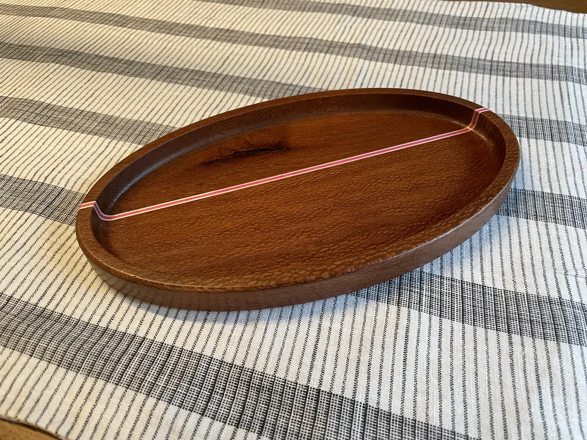 Of the three different trays, I think I like the curly maple with the pink dyed veneer strips the most. The pink really stands out against the lighter maple. Most people I talked to liked this tray the best as well.