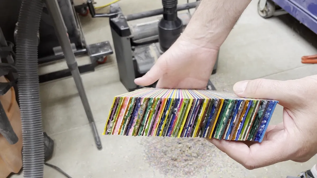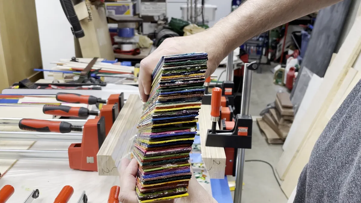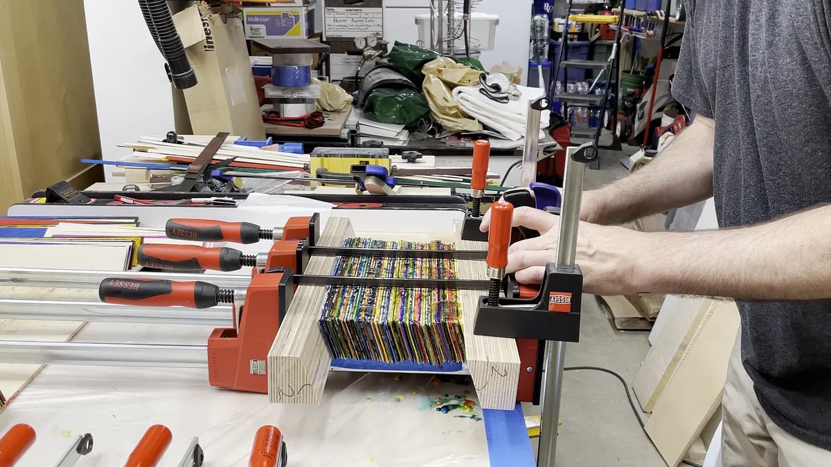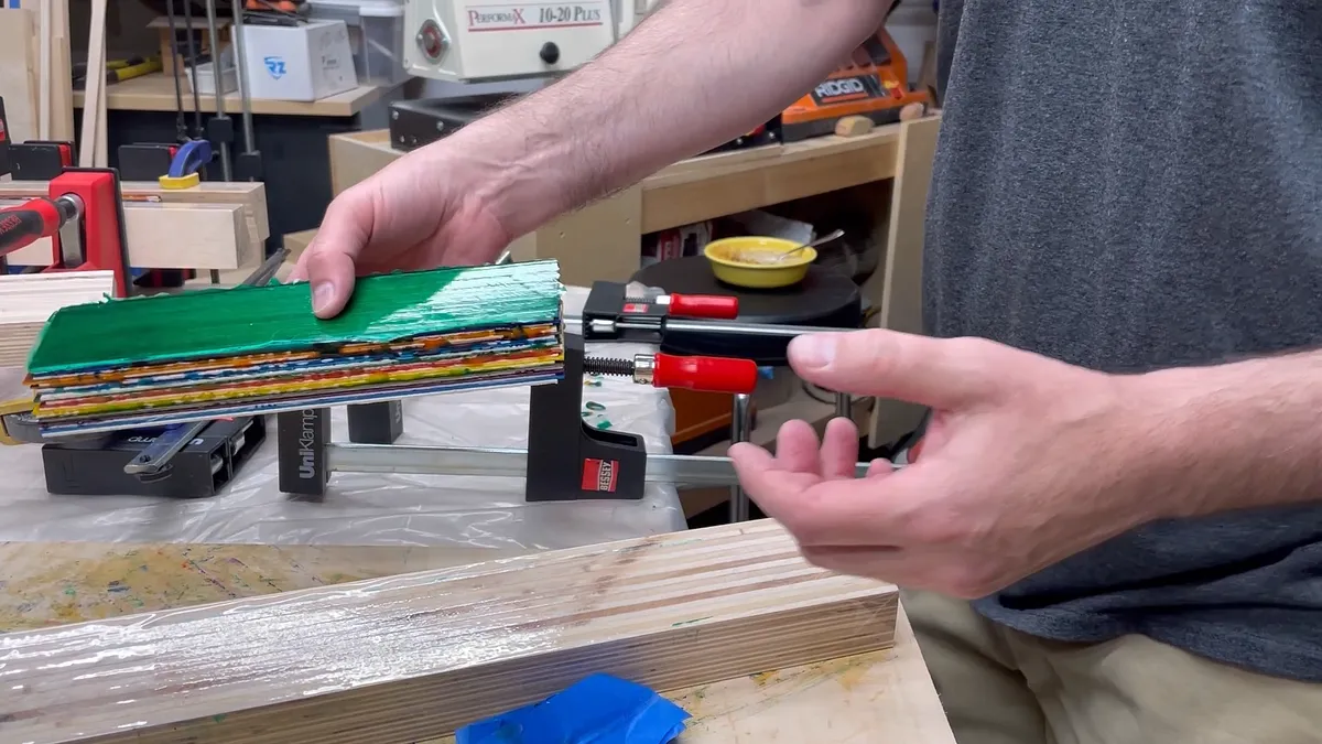I used Titebond Original wood glue for these and if you have used it before you know you really only have about 8 to 10 minutes before the glue starts tacking up. For that reason I split the overall glue up of the veneer sections into multiple pieces. I found that I could glue enough pieces together to make a piece up to 1-3/8” thick. I made multiple pieces this size and then glued those sections together to get the overall wood blank.