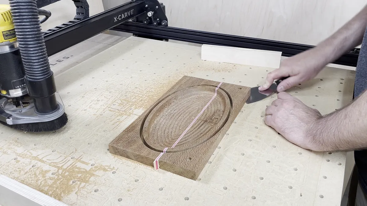 Next I go through the carving operation. I carve the tray recess out first using the bowl bit. Then I switched to a 1/4" downcutting spiral bit and cut the outline of the tray. Since I am using double sided CNC tape I did not use tabs for the cutting process when cutting the outline.