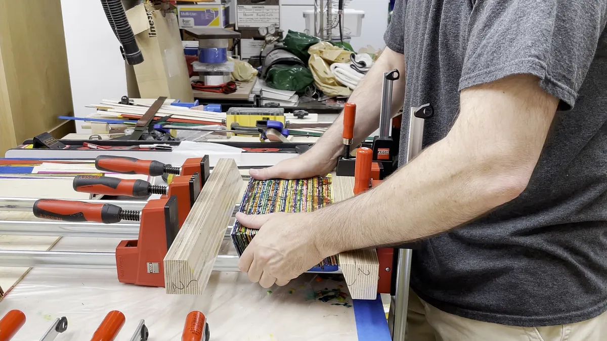 To glue pieces of veneer together at 20 degrees, I needed to make a couple pieces of wood that would hold them at this angle. These clamping cauls also help distribute the clamping pressure on the pieces of veneer.