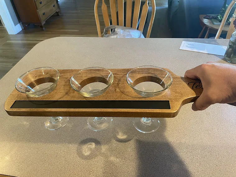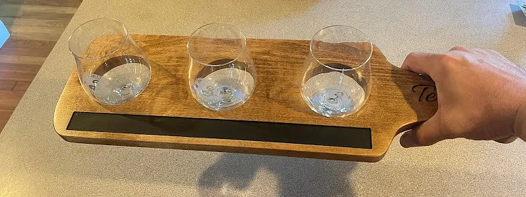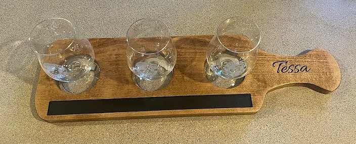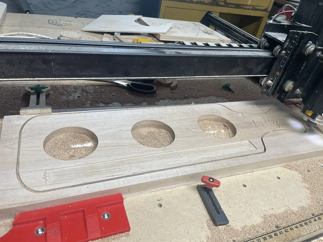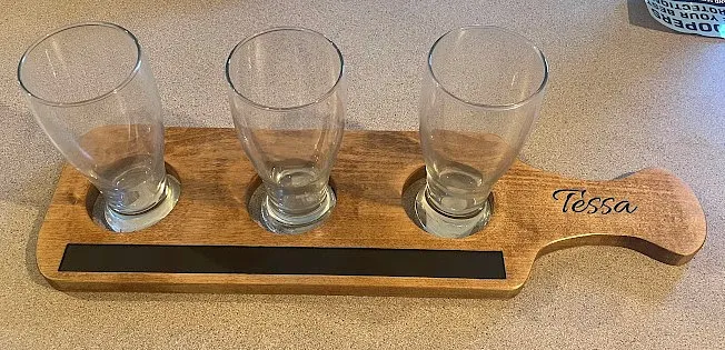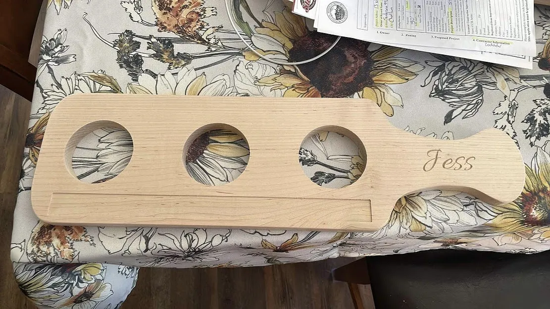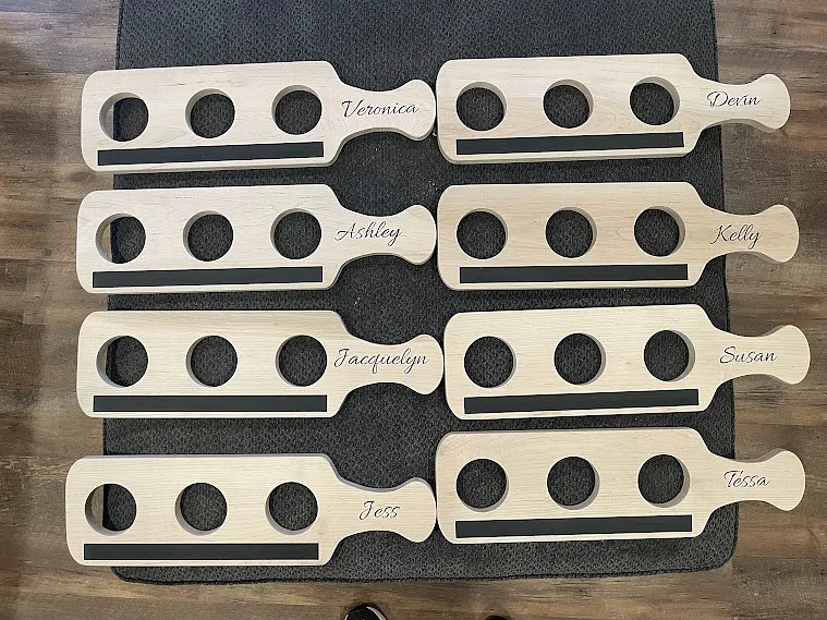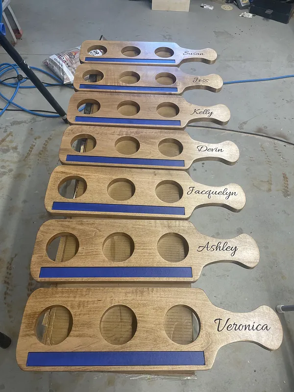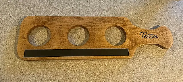 I used a piece of 3/16" luan as a sacrificial board and used double face tape to attach 3/4" maple to the luan. I carved the name in the handle first using a 1/4" 60 degree V-bit . Obviously a name is optional. I carved the paddle and the "chalkboard" cutout with a 1/8 double fluted straight bit. The "Chalkboard" is made with chalkboard paint.