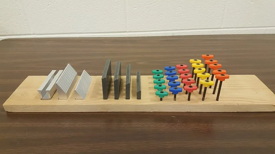 Simple board to organize the basic clap set for an X-carve. Set up to fit 5" x 18" x 3/4" board. Board Pictured is 24" may add bits slots