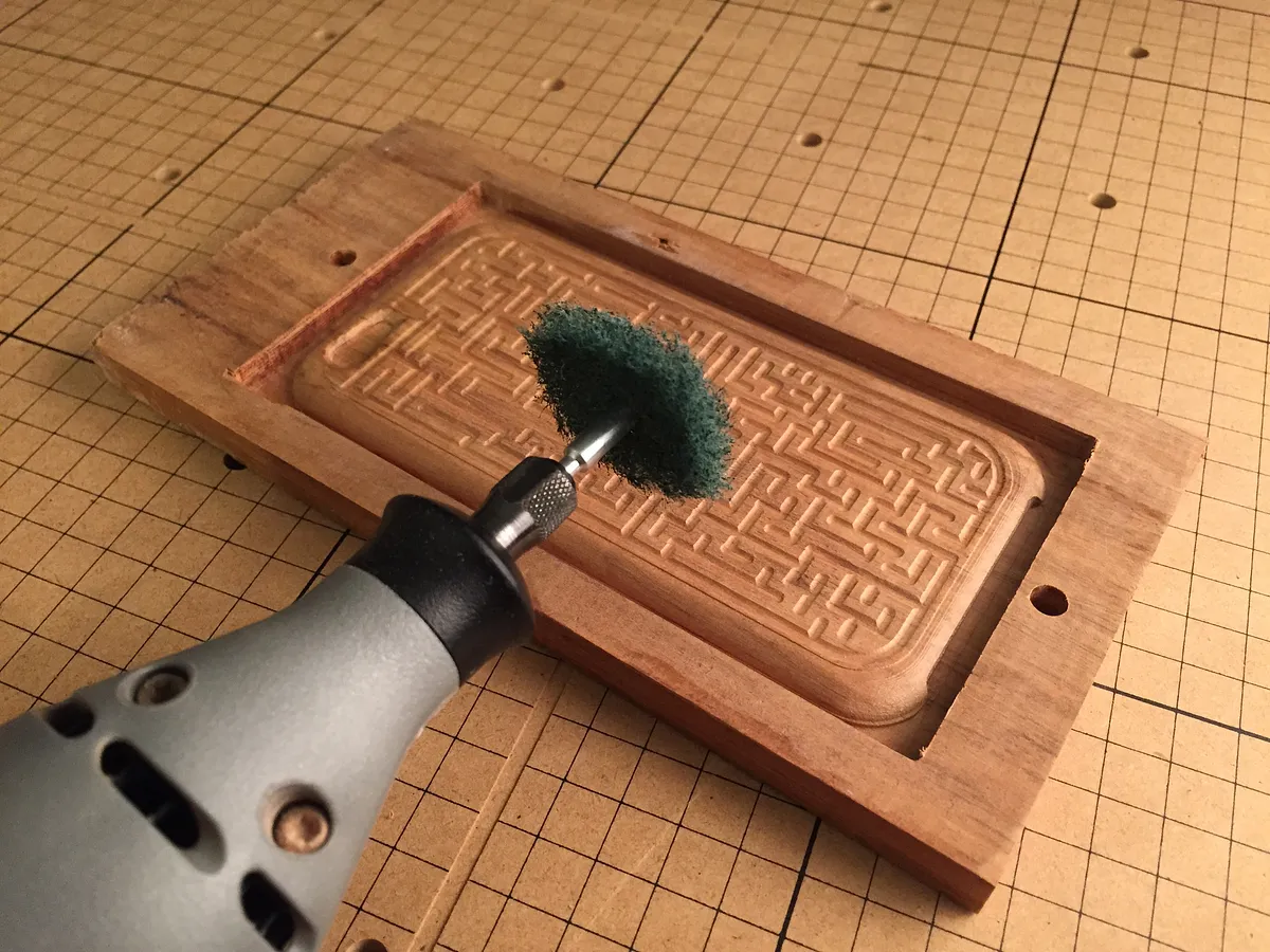 After each corner is carved out, then de-burr and sand the case. I used the wire brush and scotch-brite pad from above to smooth everything out. You may also want to round a few of the edges with the sand paper as well. Start with a 150 grit sand paper and work up to a 200 or even 350 to get it all nice and smooth. You may also want to stain or finish the case, but remember that it will be held and placed near a face, so use caution when choosing a finish.