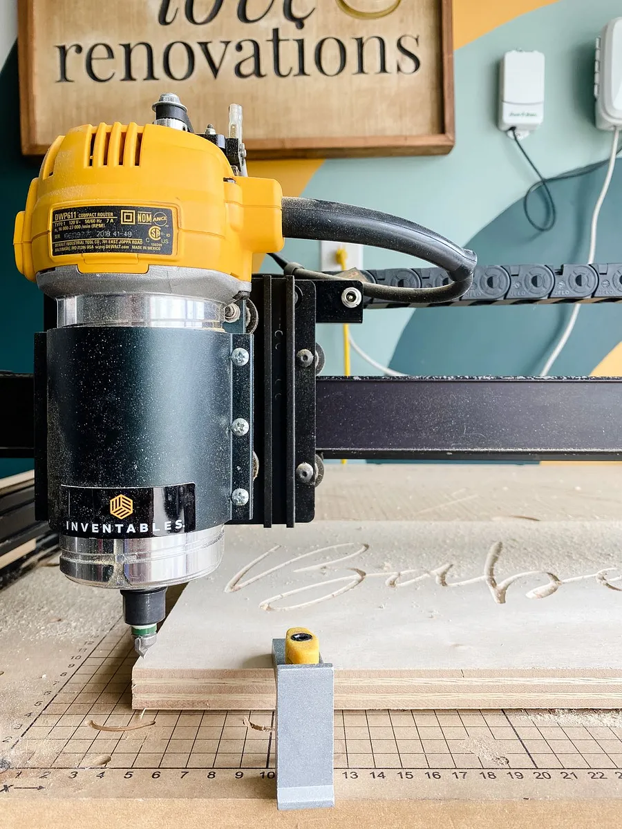 Carve the chosen design - my design is for a home gym that my friend affectionately dubbed the "Babe Cave", but you can obviously adjust to whatever you'd like! The key is to carve using a 90-degree V-Bit and to carve about 1/8" into your plywood or scrap wood.