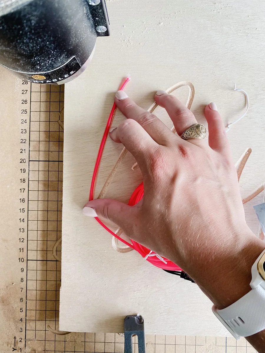 You can find EL wire on Amazon for about $10 - I attached using DAP's RapidFuse adhesive. I found it was the best glue for the sign as it didn't make a mess, it set quickly, and was essentially invisible once it dried. Attach the EL wire all along the channel you carved, then cut off the excess!