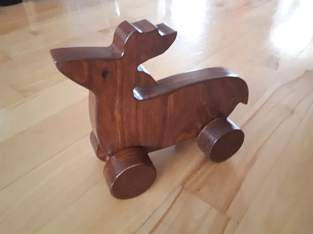 Rolling Deer Toy. Cut 2 pieces of Birch plywood 5/8 and glue together. Glue wheels 2 by 2 and join with 1/4 wood shaft.