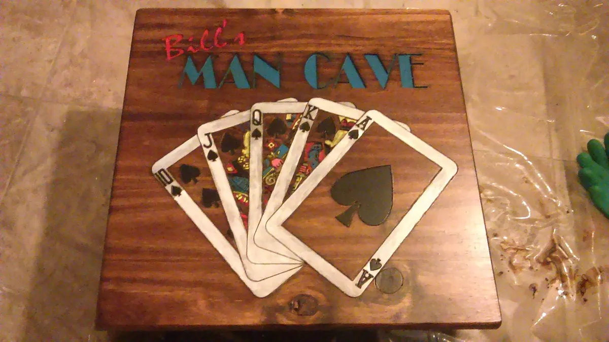 Bill has his recently dominated portion of the house that his loving wife isnt allowed to decorate so he needed a sign declaring its autonomy and I made this for his Christmas present. X-Carved with a 1mm bit, sanded, stained, painted with acrylics then poly coated till it shined. Bill loved it.