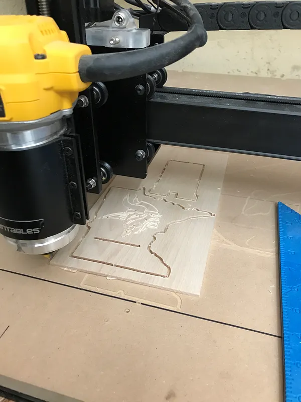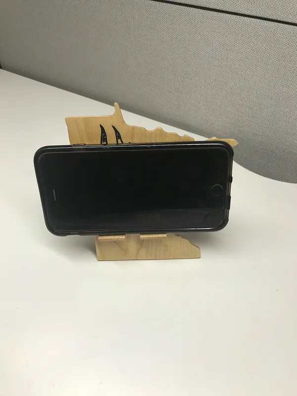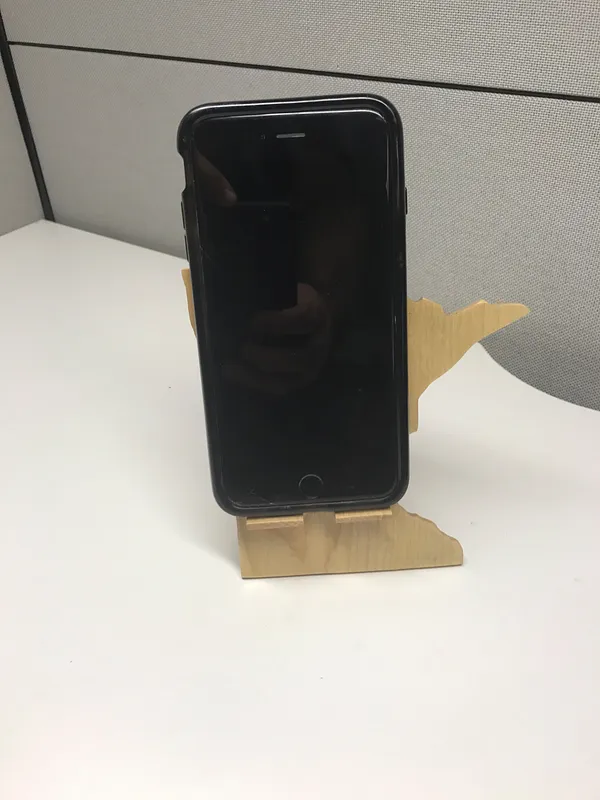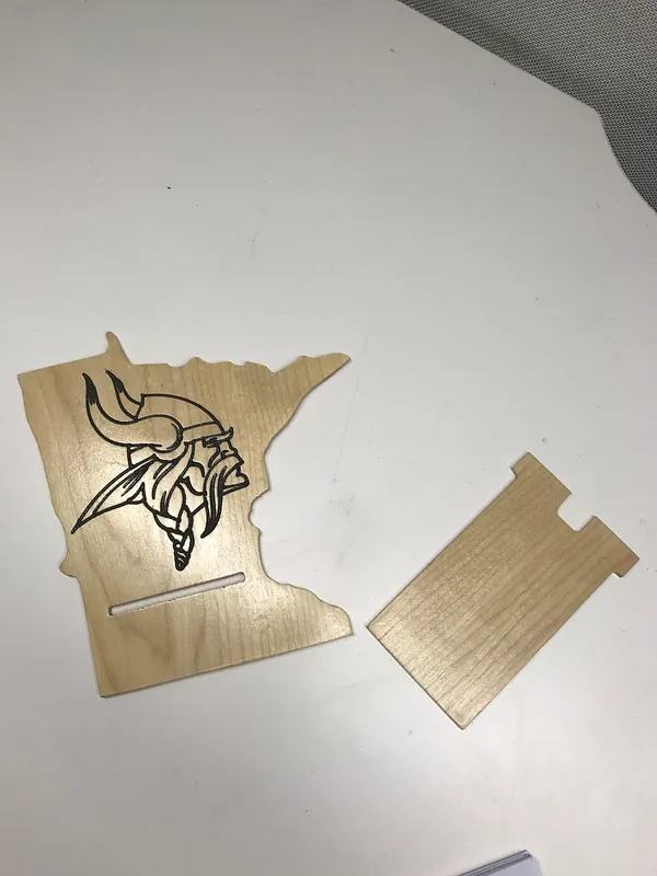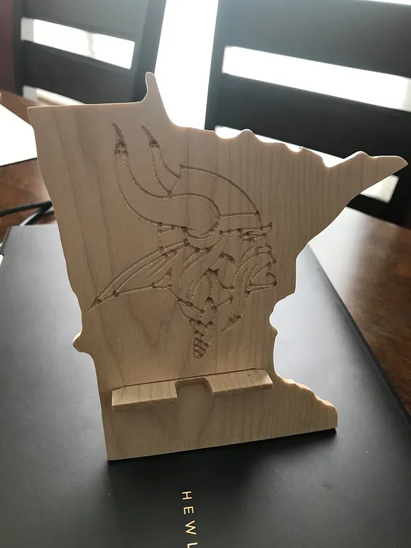 Cellphone stand, made as a gift for a coworker. My Coworker is a huge Minnesota Vikings Fan hence the Viking cut using Easel's new V bit Carving feature. This is a simple design that works great and can be modified to an shape you desire.