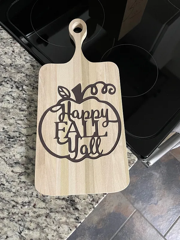 Decorative Cutting Board - Fall Y'all - is made with 1/4" compression bit, 60° V-Bit, poplar wood, 5/8" cutter, and black spray paint. Cut, engrave, spray paint, skim cut across face (by hand) to expose design, sand, enjoy!