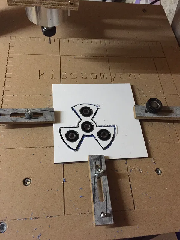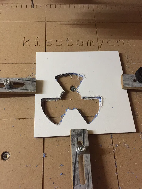 I downloaded the Nuclear svg symbol picture of google. I designed the pattern with Easel. Then I carved a two-layer HDPE.