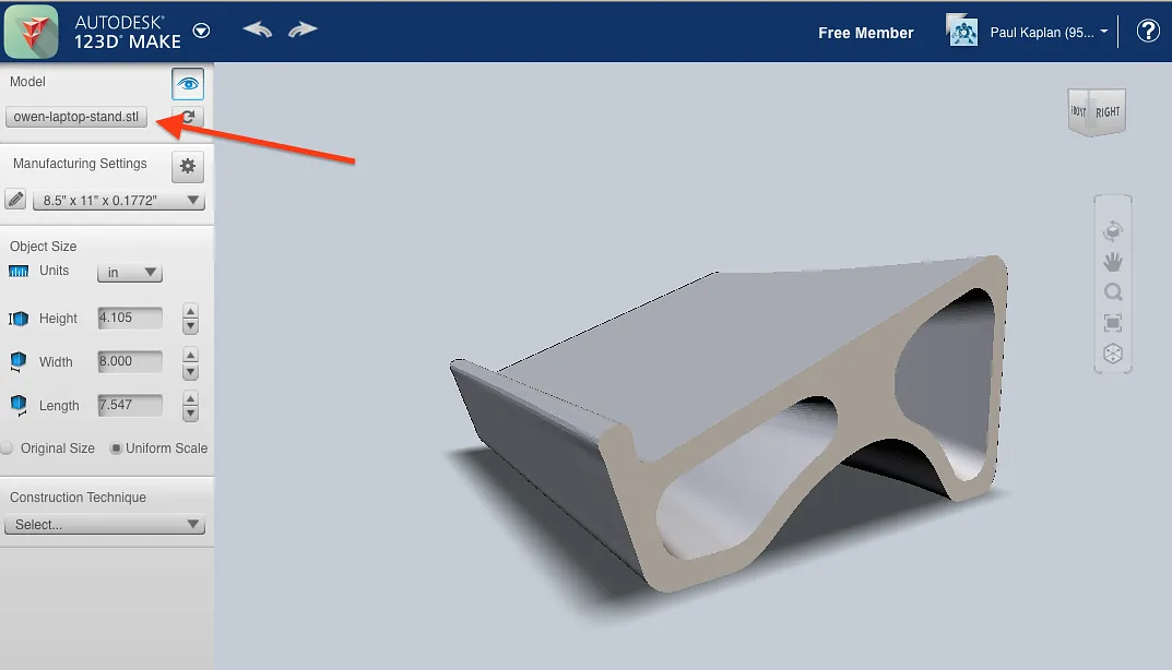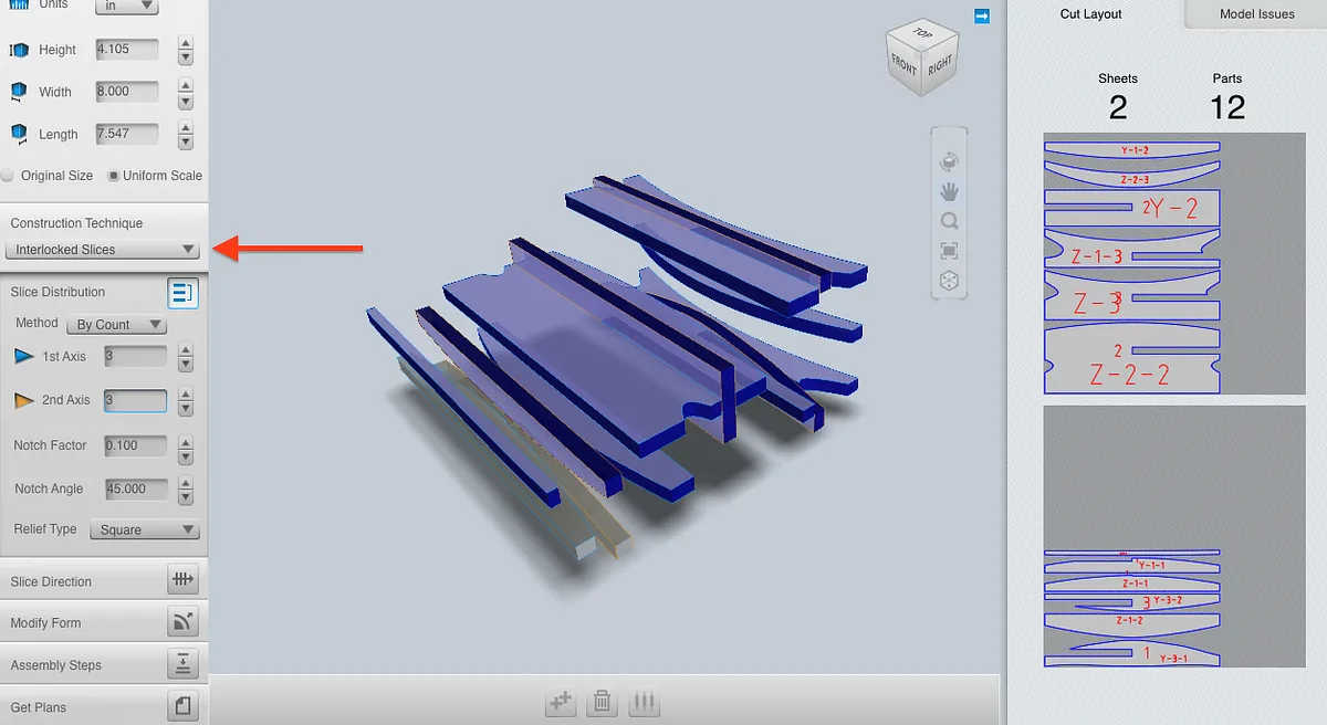 There are many options under the "Construction Technique" dropdown. They refer to different ways to slice up the 3D model into 2D panels. The one that works best for this model is "Interlocking Slices", but play around with the others too!