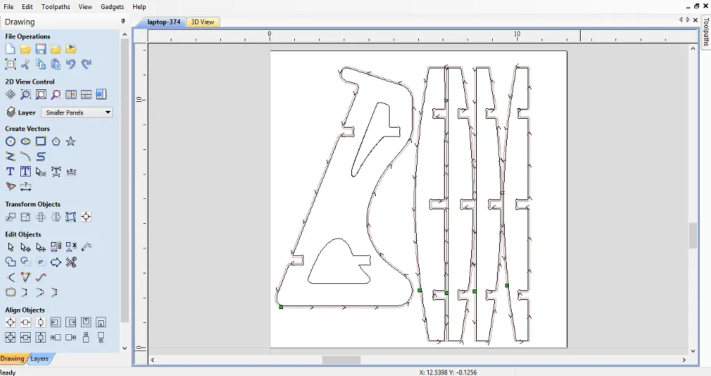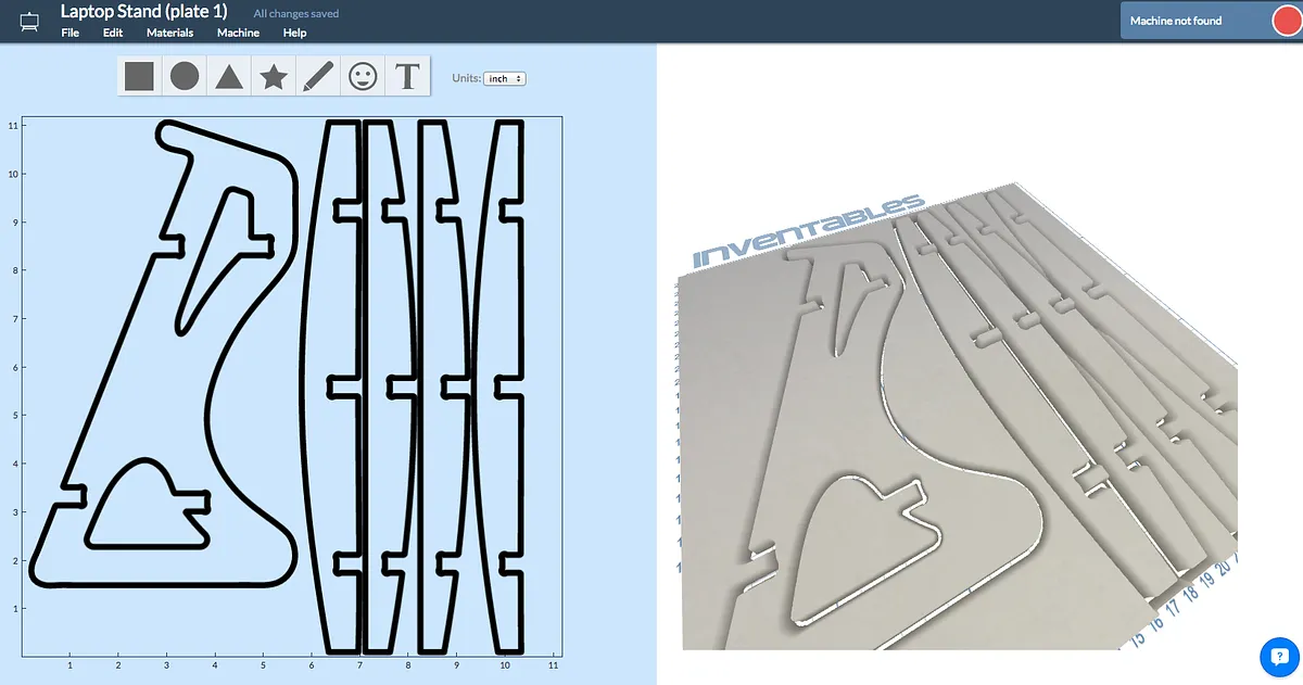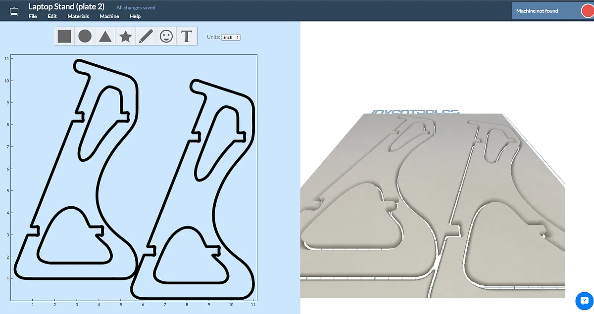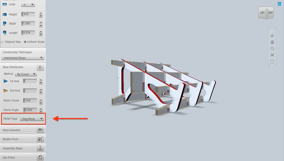 Because I'm using a 0.125" bit to cut out the design, I have to make sure that the inside corners of the interlocking slots are "dogboned" to make sure the pieces can fully slot together. Luckily, 123D Make had a built in option for this!