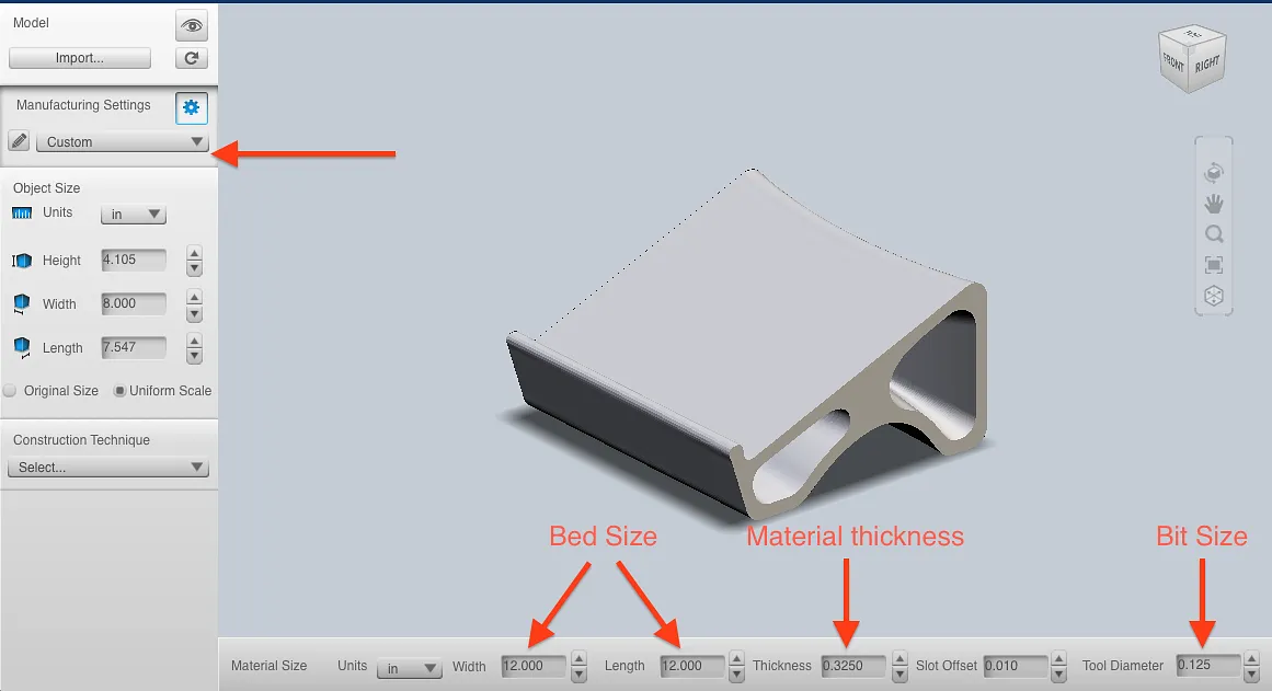 The default settings are for laser cutters, but we can easily adjust them for the Shapeoko or other CNC mills. Just enter the bed size as the width and height, enter the material thickness (measure with calipers first!) and enter the bit size you'll be cutting with.