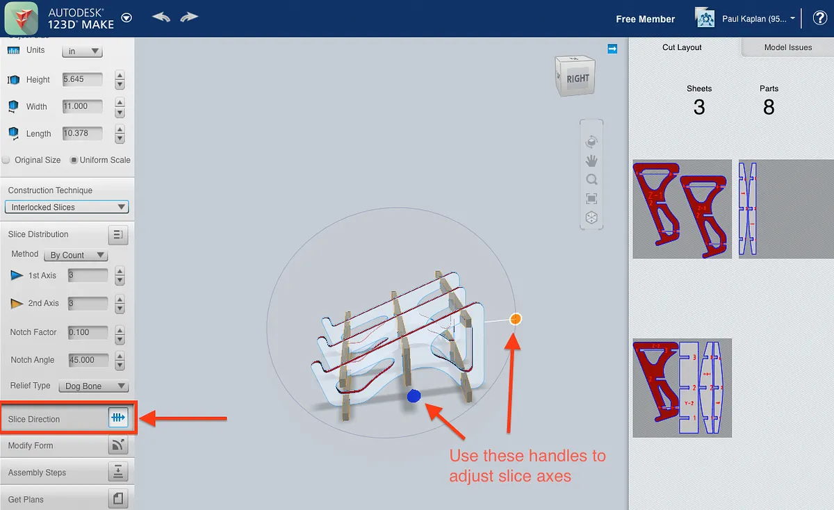 Now the sliced model still looks a little crazy (and physically impossible), so lets wrangle that by adjusting the slice number and slice axes. The slice axes can be adjusted using the blue and orange handles. It is a bit hard to manipulate them at first, but the trick is to use the subtle snapping that happens at the 90 degree points. With a quick flip of the axes, the model looked like I wanted it to (and became physically possible to stand up).