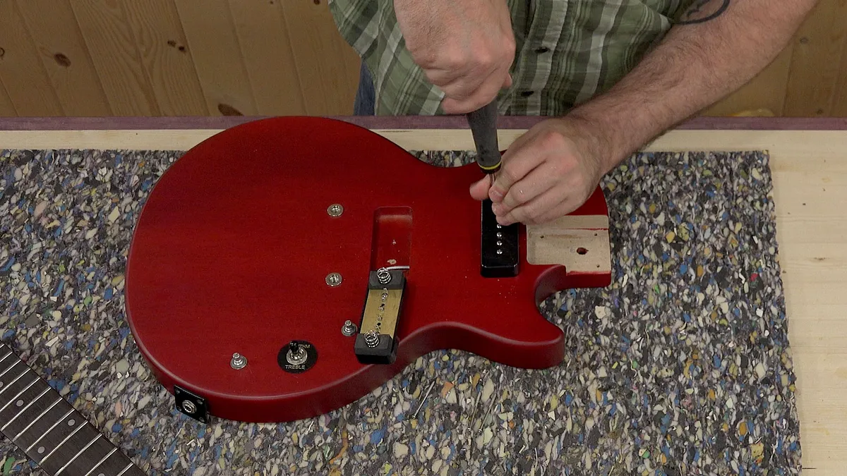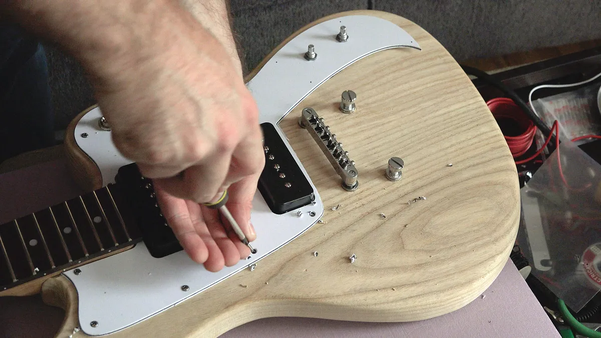Now it's time to drill the holes for the volume, tone and pickup switch into the the pickguard and attach it to the guitar.