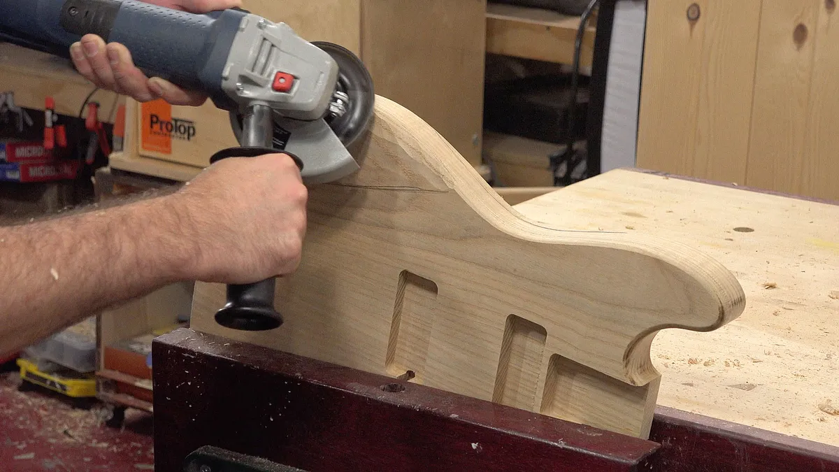 Next I use an angle grinder to carve out the arm contour and belly cut. You may need to reference a Fender Strat.