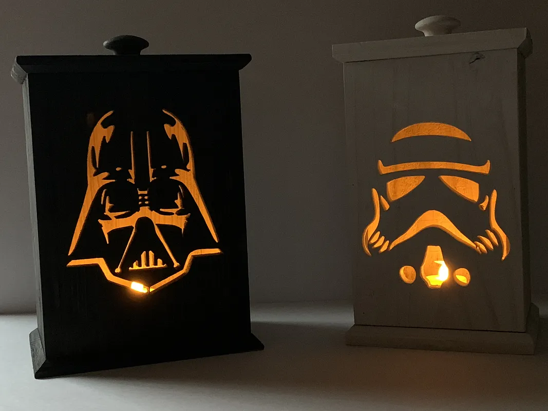 This is a pretty simple project. The size of the box is really up to you. I made mine 1/2" x 5.5" x 8" for the Storm Trooper and 8.75" for Darth Vader. The depth of the sides is entirely up to you. Mine are 4" and sandwiched between front and back. Glue and 23-gauge headless pins are used to assemble. I chose to paint mine black and white, keeping with the StarWars color scheme but I also considered staining the outside boxes orange in keeping with the Halloween season. If you use cedar, keep in mind it is a soft wood and carves easily but also breaks away so I used the tape and CA method to hold the blank to the spoil board.