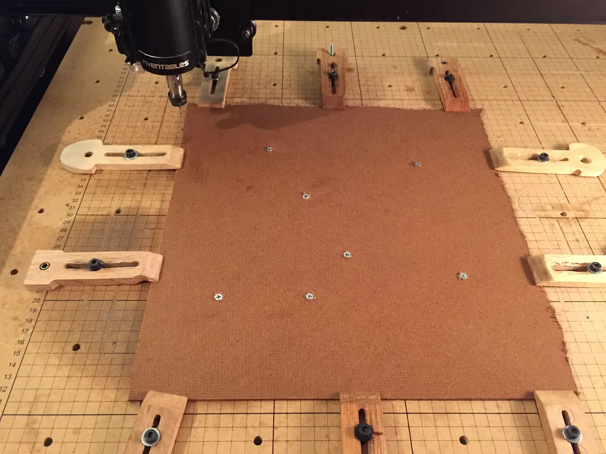 Clamp down your material and use either some double sided tape in the middle of the piece or have Easel pre-drill some holes in strategic places and add screws to help hold down the middle. (Thanks for the suggestion Erik Jenkins). I find it helpful to do all of the above... clamp, screw, and tape.