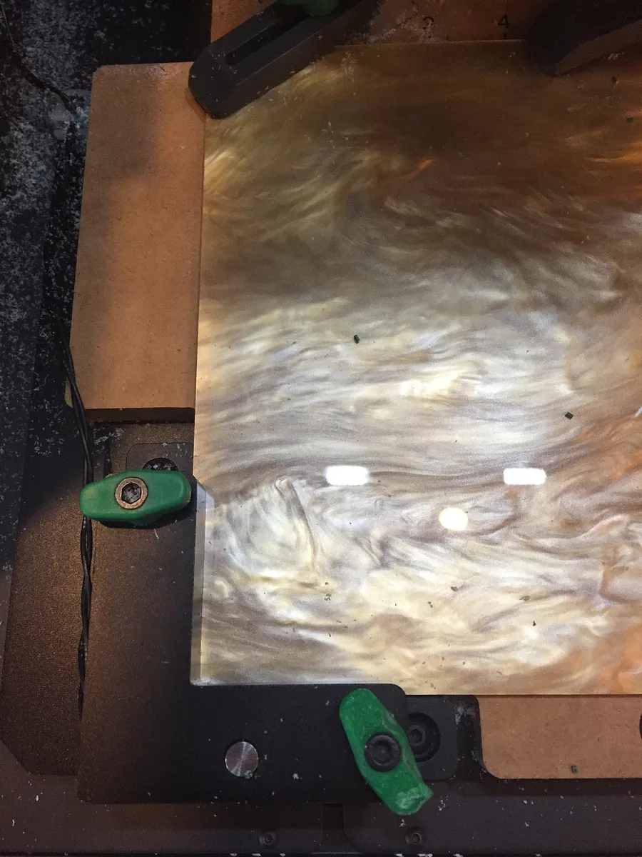 Now that the design is done, select the material and bit you would like to use. I have been using the 1/6" upcut fish tail but (blue collar) and glitter acrylics.