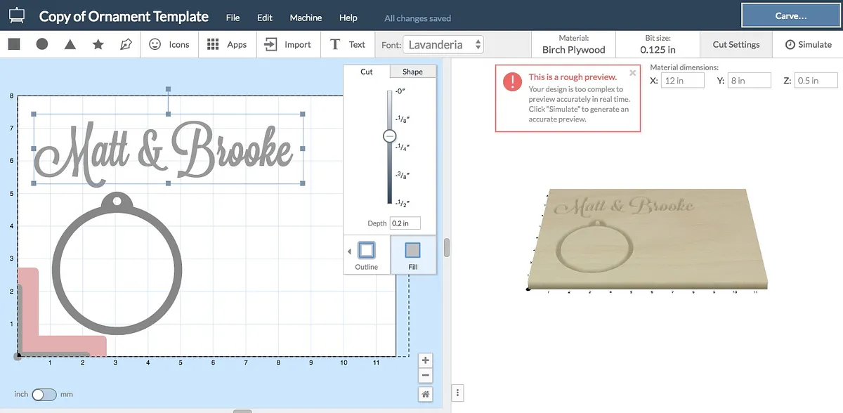 Click the "simulate" button to make sure your project will cut the way you are anticipating. If you see red, don't panic. Red parts will not cut. You can either make the design larger, or if you are happy with the simulated carve, ignore the red areas.