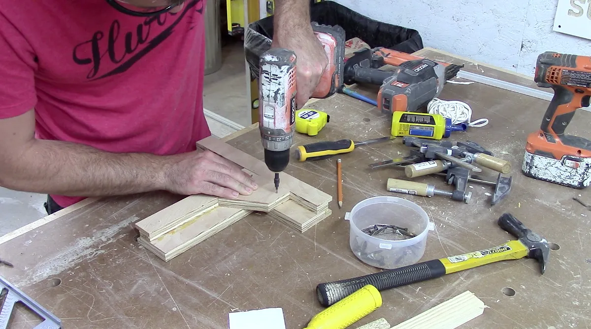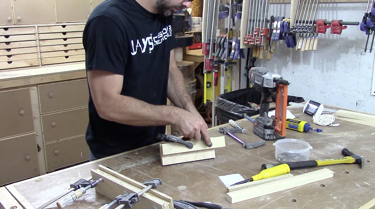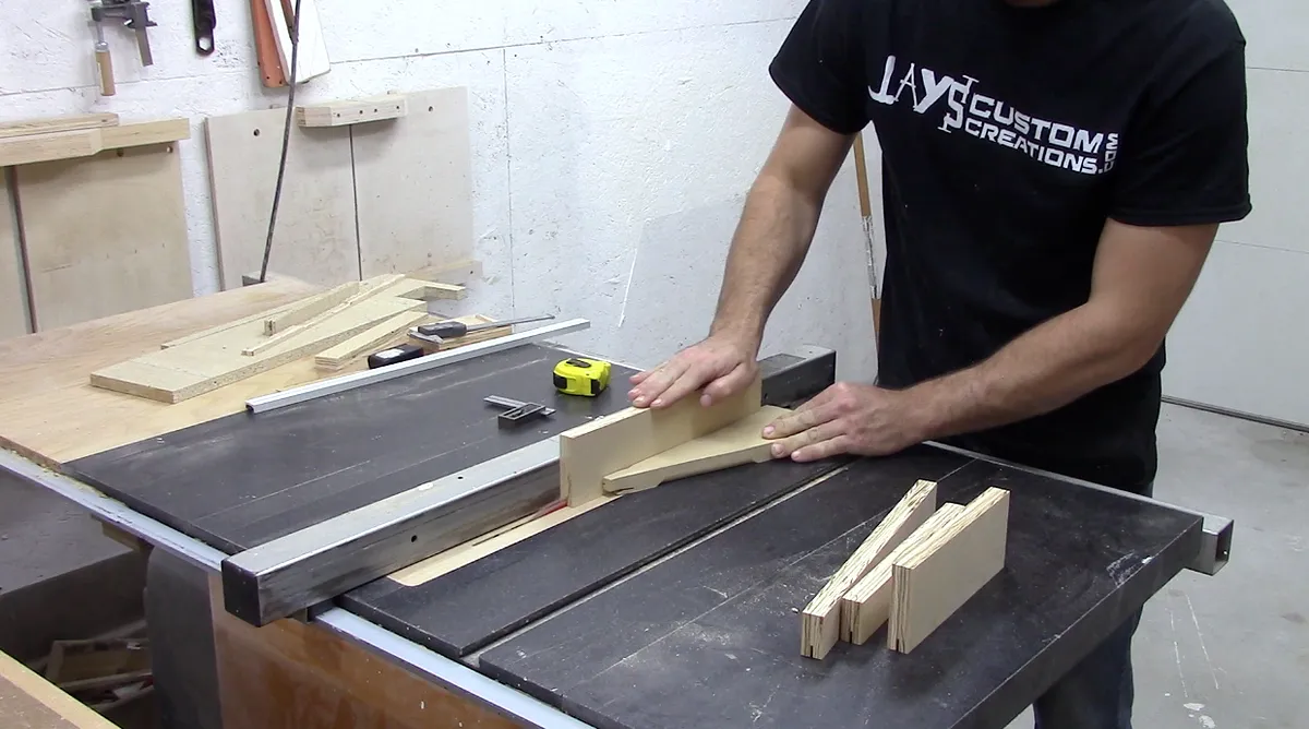 I then screwed the first section to the second section creating a T-shape. I then used a small piece of scrap material to make a corner brace and screwed it into place making sure the jig is kept square.