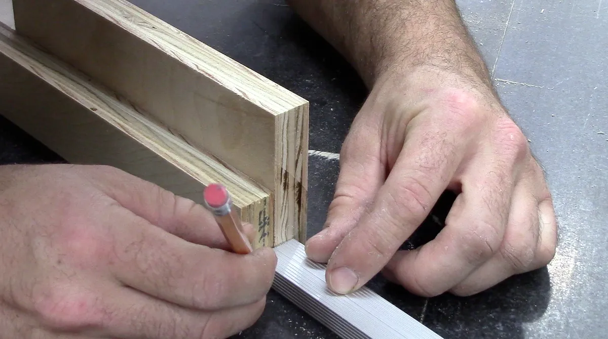 Next we position the bit for the mortise by making a mark of the thickness of our material and aligning the center of the bet with that Mark and the edge of the board. We can then go ahead and cut the mortise.