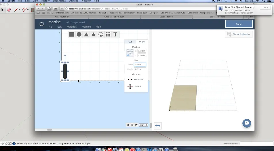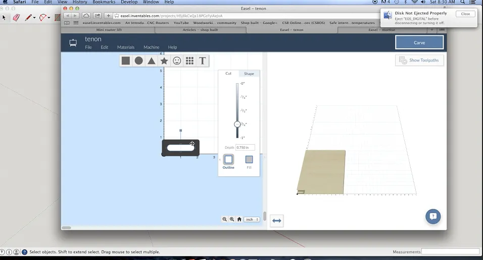 I then loaded the tenon into easel. (if using my easel file then it will be the one at 0,0 so just delete the other one at 0,4 for now ). Then make sure the tenon is cut out on the “outside path” and the outside of the material is cut out “on path” It is also important to make sure the outside portion is cut first. This is down by selecting edit and then going to “bring forward” a few time until its all the way forward.