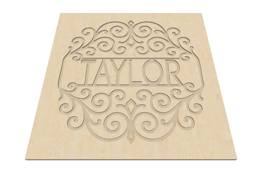 An engraved monogram for the last name Taylor using the royal style engraved with the Code Pro font.