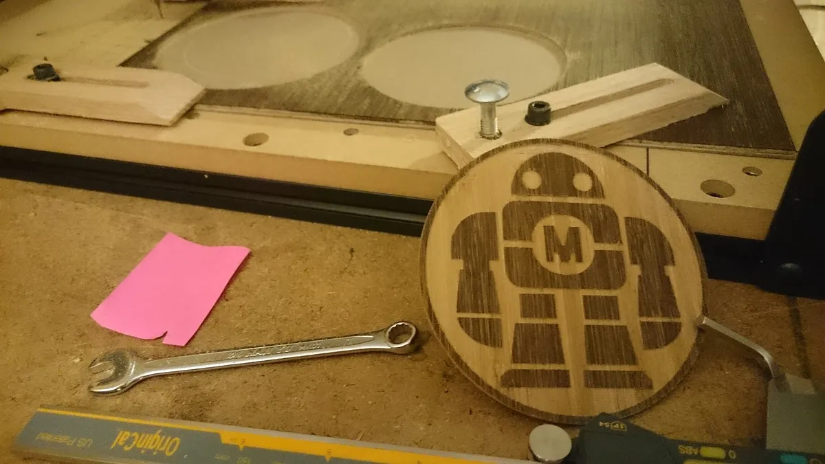 A drink coaster featuring Makey. I suggest staining a bamboo sheet before cutting for best results.
