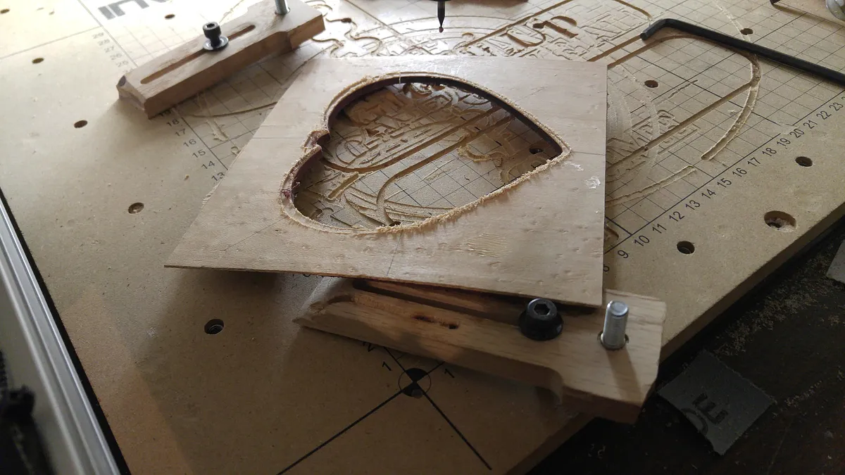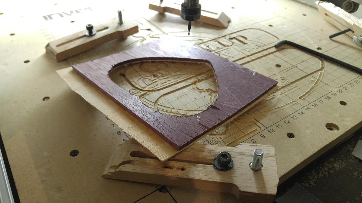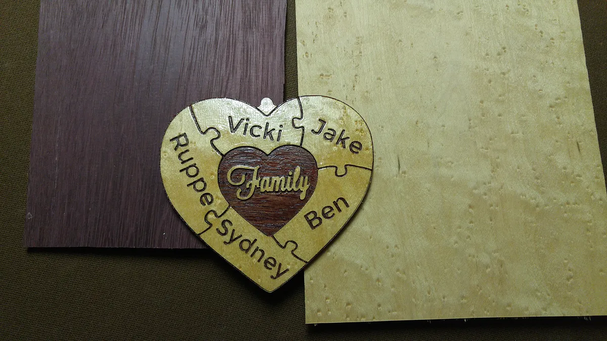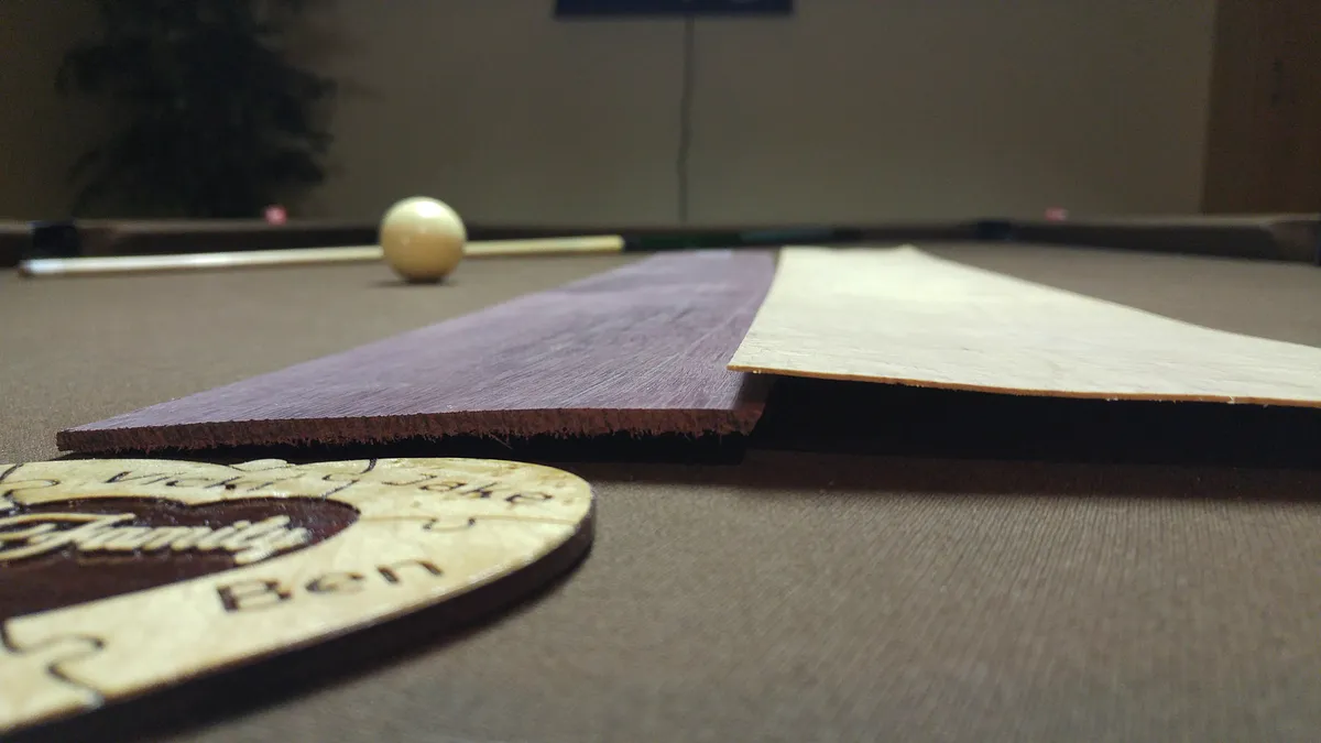 Set the depth of cut to just deeper than the veneer or top wood/material. Remember you want to carve into the other material to see the different woods. I used a 1/32" bit at 0.025" depth per pass at 35in/min. Took about 15min.