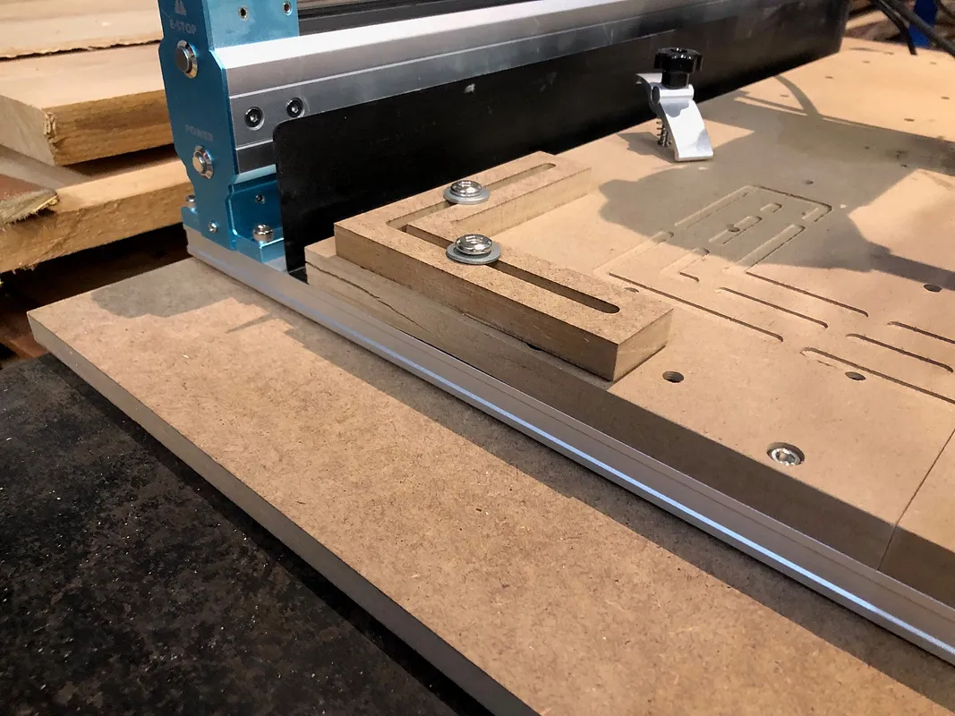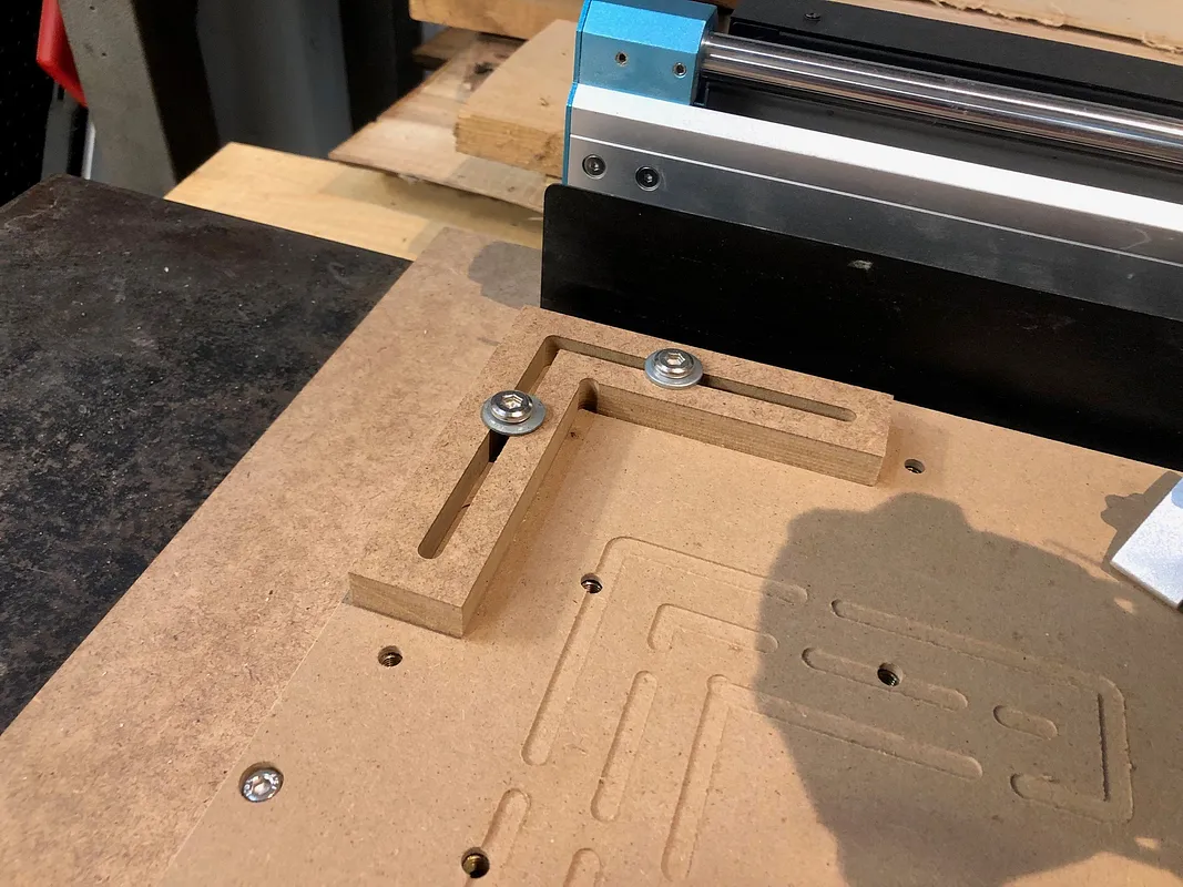 Easy, quick carve with MDF to make a 90 degree angle positioning jig. This jig can be mounted directly to the spoil board with a couple of bolts and washers.