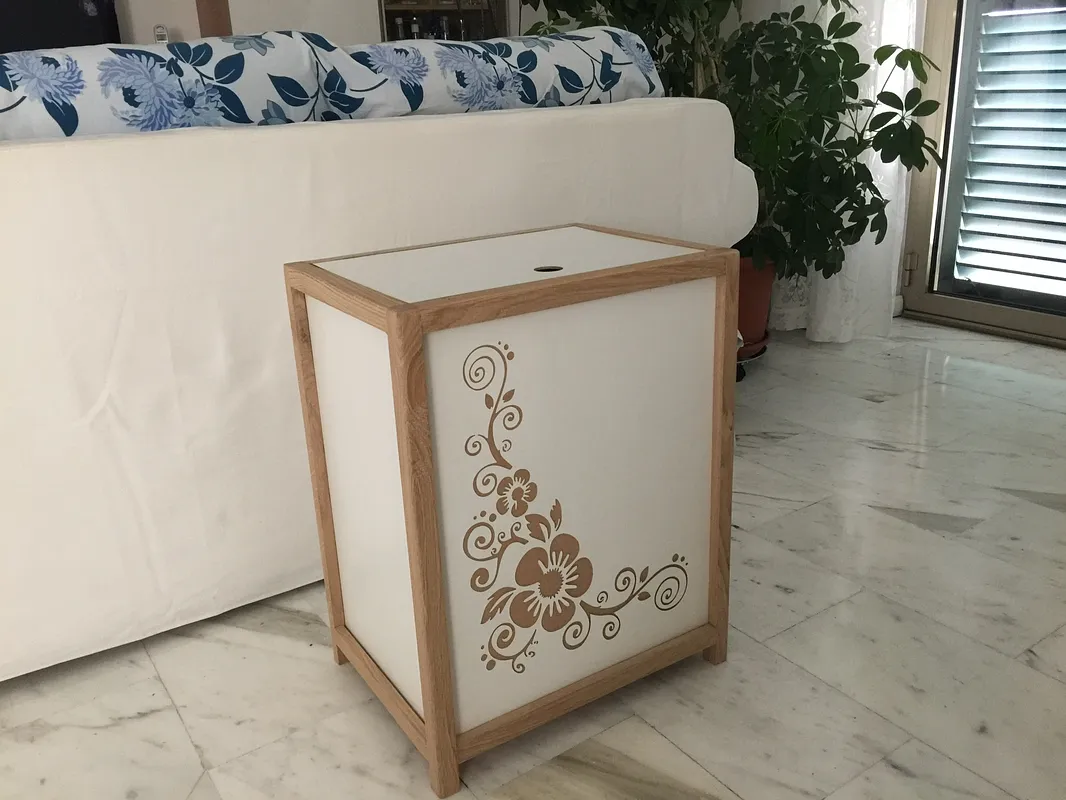 Simple basket for washing cloths Dimensions L18.5 x W 13.77 x H 23.60 inch Oak frame 1 x 1 inch White MDF