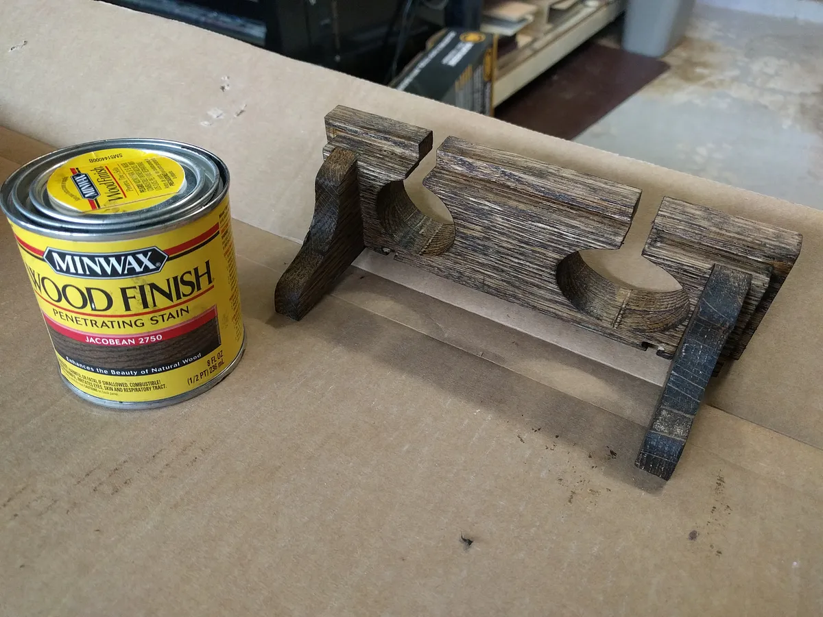 I started using Jacobean, but it wasn't dark enough. I then applied espresso stain afterwards. Not perfect, but will do the job. After it completely dried, I applied a few coats of sealer.