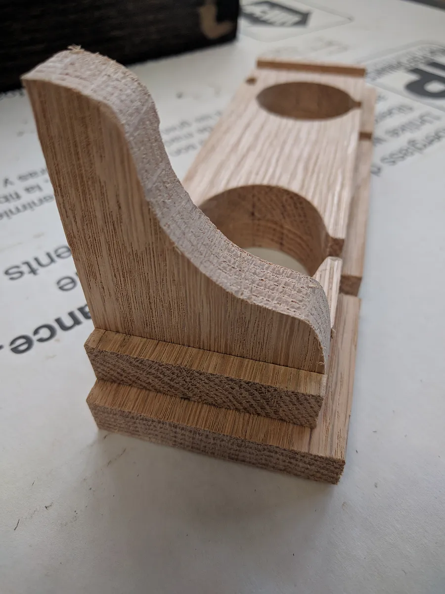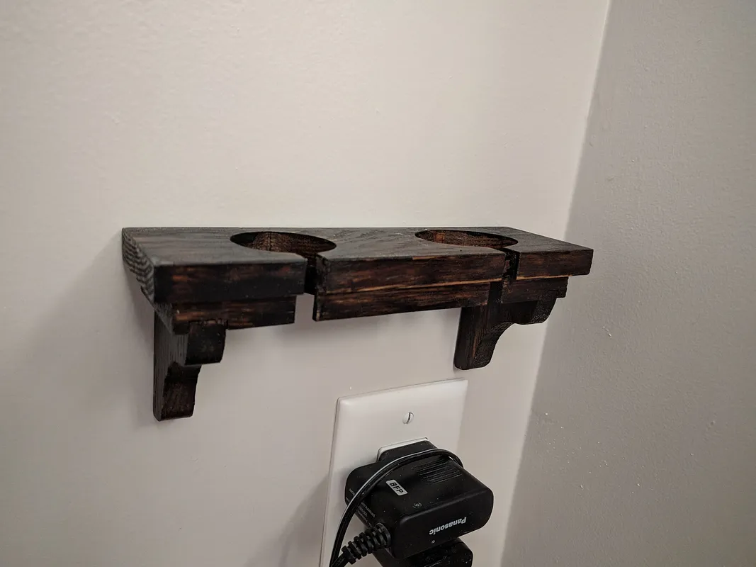 I wanted a shelf that I could easily mount near the wall outlet to keep the razors off my sink. I used Easel to come up with a stacked shelf with a wall mount keyhole and a slot for the power cords on the razors.
