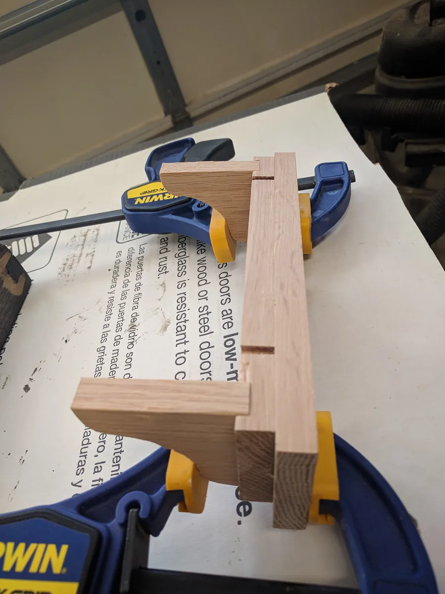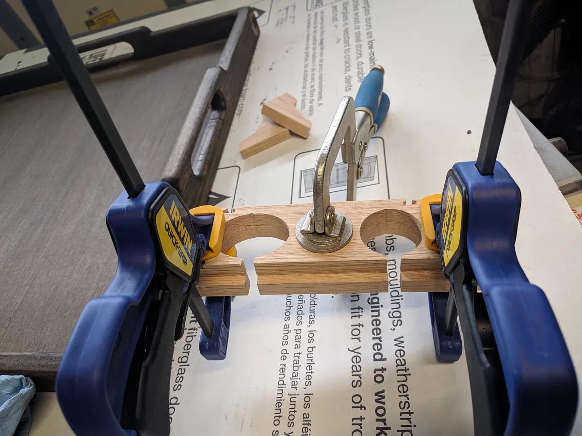 Next step was to glue and clamp the shelf stands to the bottom of the board and wait for it to dry.