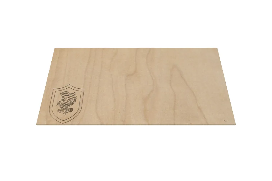 A shield with an Eagle holding a flag cut out of Hard Maple. The shield will fit on a piece of material that is 12 x 12 but can be scaled down. It requires a V-Bit to get the detail and an end mill to cut out the shield.
