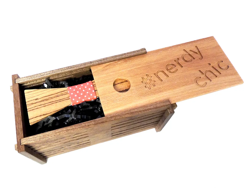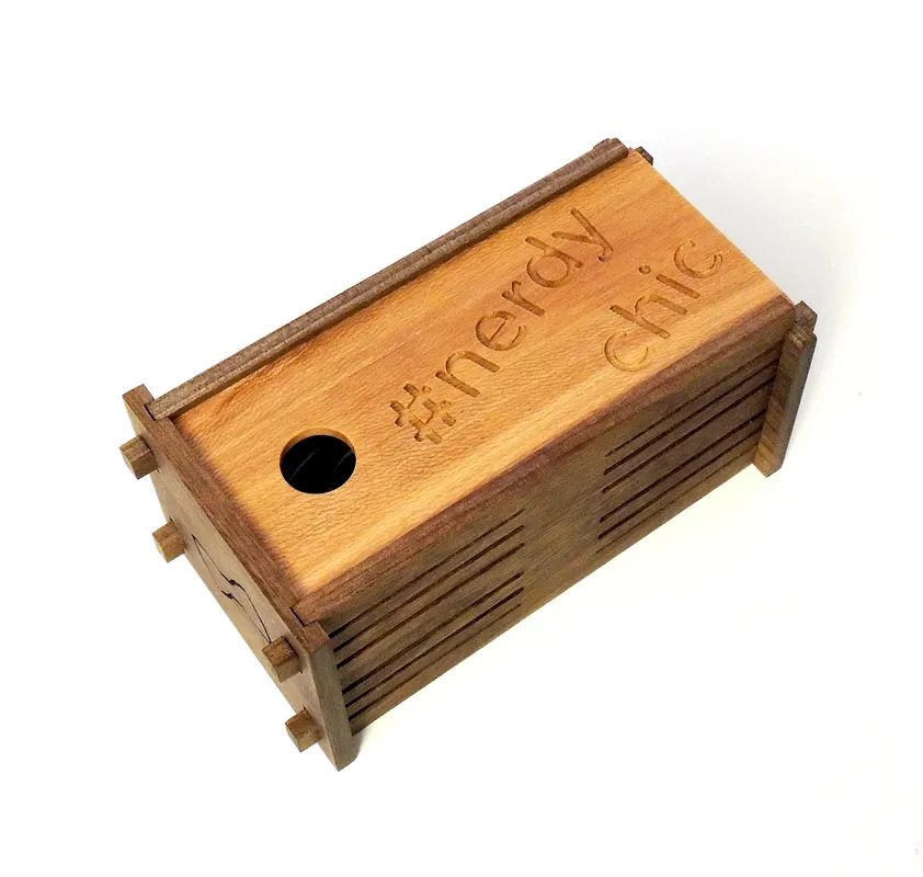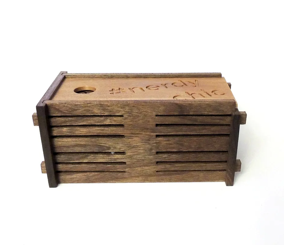 The idea here is that the hook tabs on the long sides fit through slots on the short sides when bent down, and then they spring back when pushed through the slots. This holds the box sides together nice and tight. The sides also fit into groves for further stability. The box bottom is fit into a groove slot all the way around all sizes, so it is also held fast. The lid is in a similar groove slot on 3 sides, and one of the short sides doesn't rise up to the level of the lid, so it can be slid off. The design is very simple. The box is adorned with engraving on the lid, and on one side. I am using this as a gift box for a wooden bowtie, so my engraving reflects that. You can change it to whatever you want that fits your gift. This design is 6x3x3 inches, roughly, but could be adapted to larger sizes. Think wine bottle, rolling pin, whatever!